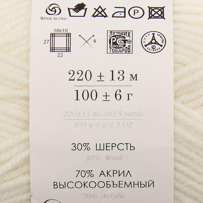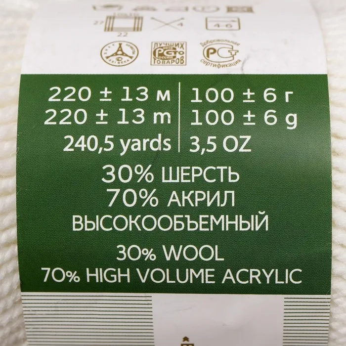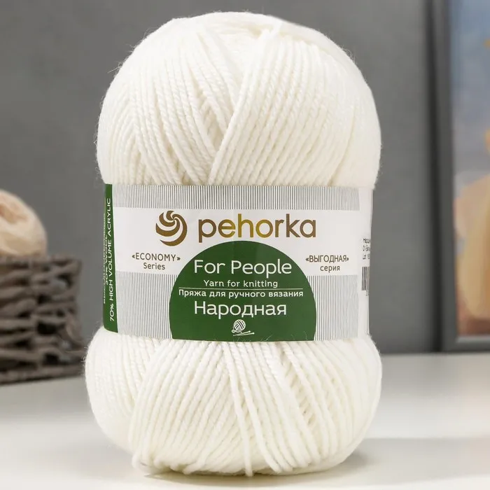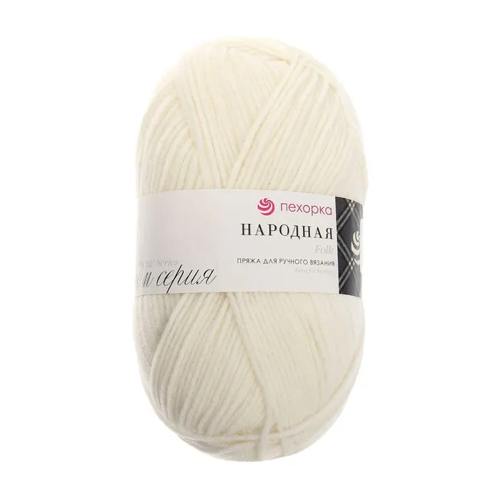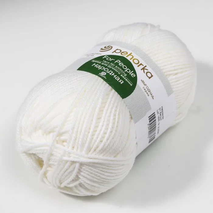 Пряжа для вязания спицами, крючком «Пехорский текстиль. Народная», 30% шерсть, 70% акрил объёмный, 220 м/100 г, (01 белый) — Характеристики