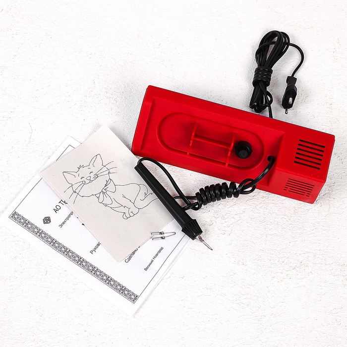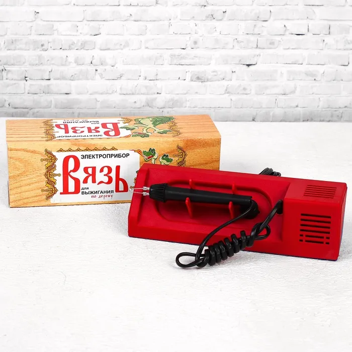Лёгкий и безопасный электроприбор состоит из пластмассового корпуса, понижающего трансформатора, регулятора накала иглы, карандаша со сменными иглами. Его можно использовать как для домашних занятий, так и на уроках труда в школах и детских садах, при обучении в кружках эстетического воспитания. Выжигание по дереву способствует развитию творческих способностей, аккуратности и терпеливости.