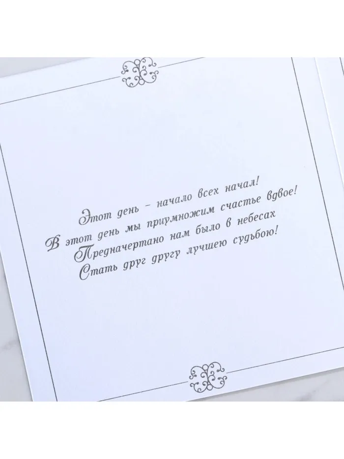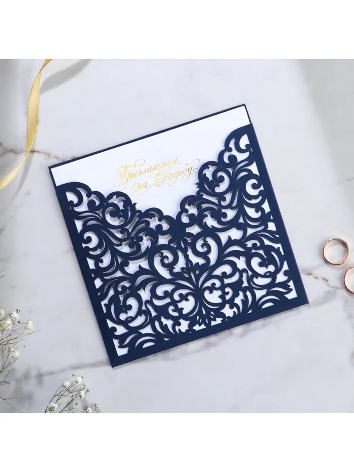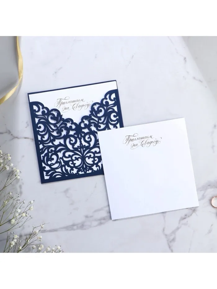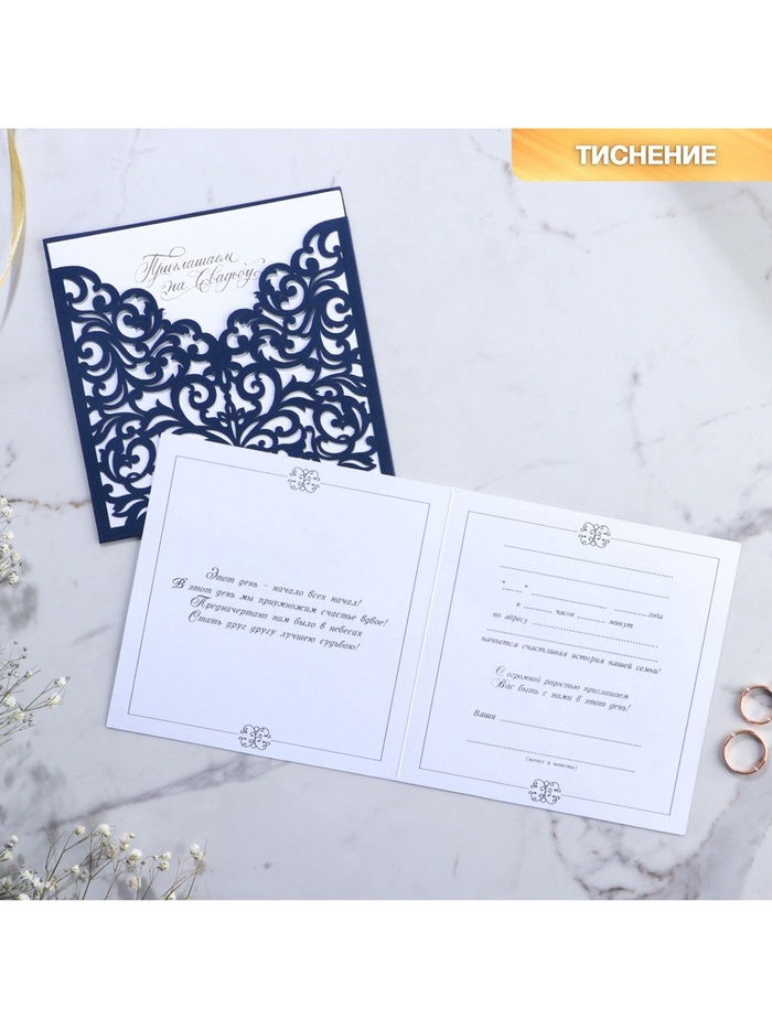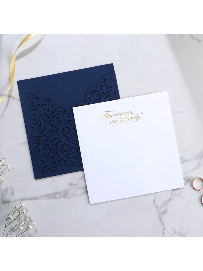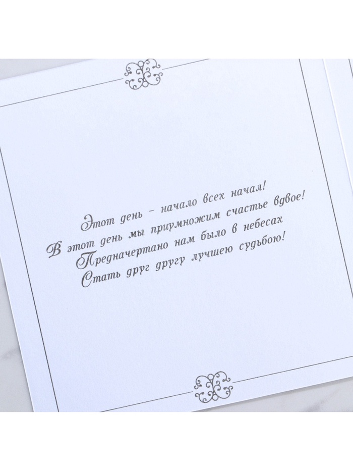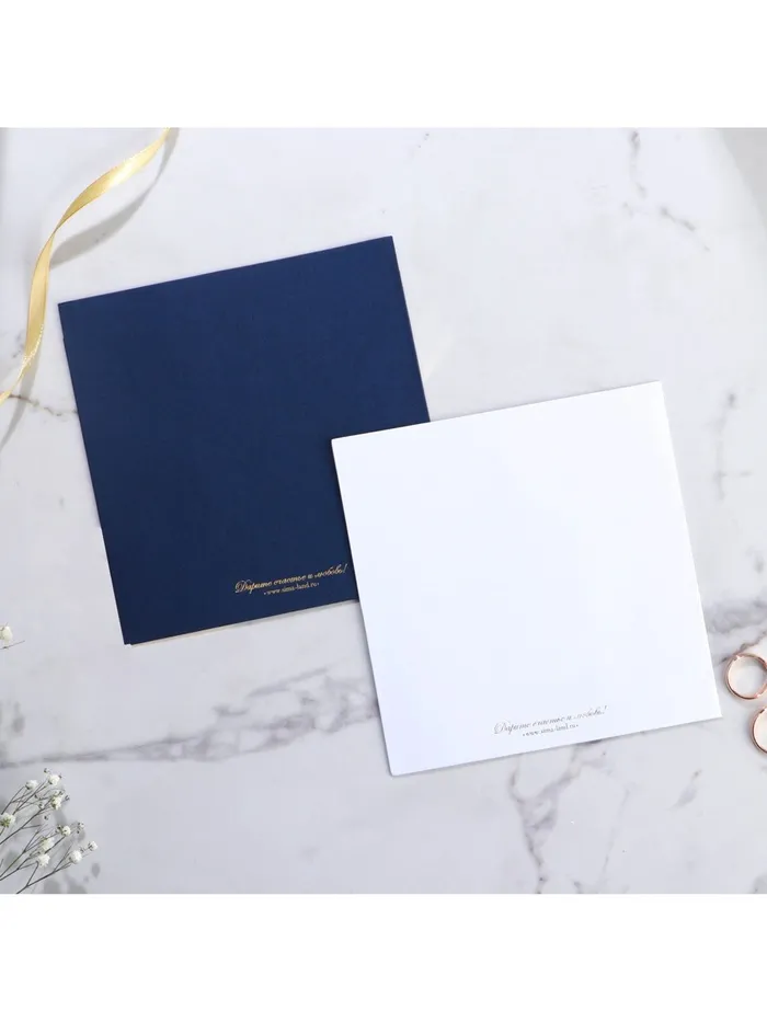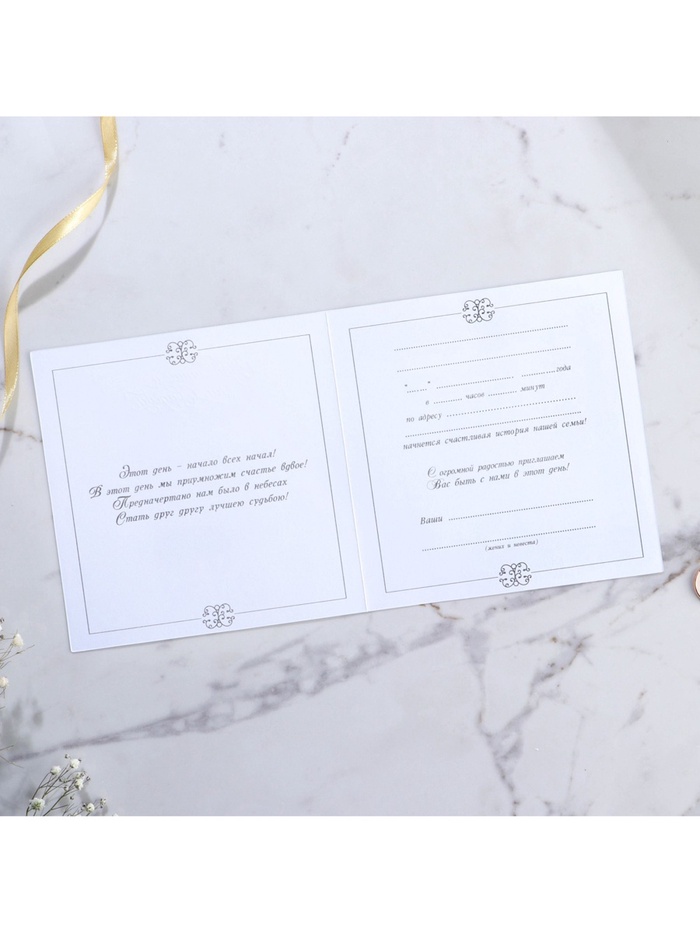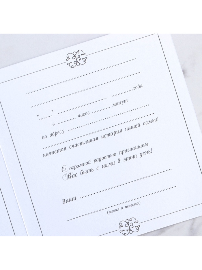 Когда дата и время бракосочетания уже известны, и вы определились со списком гостей, необходимо оповестить их о предстоящем празднике. Существует традиция делать персональные приглашения с указанием времени и даты мероприятия. Но перед свадьбой столько всего надо успеть, что на изготовление десятков открыток просто не остаётся времени. В этом случае вам придёт на помощь уникальное приглашение. Конверт выполнен из жемчужной бумаги плотностью 250 грамм, вкладыш из офисной бумаги 120 грамм. Это придаёт дорогой и роскошный вид. Текст приглашения содержит свободные поля для имени адресата, времени, даты и адреса проведения мероприятия. Это потрясающее приглашение достойно стать частью такого важного события в жизни, как свадьба!