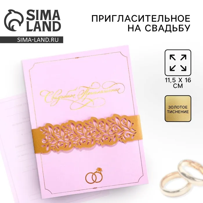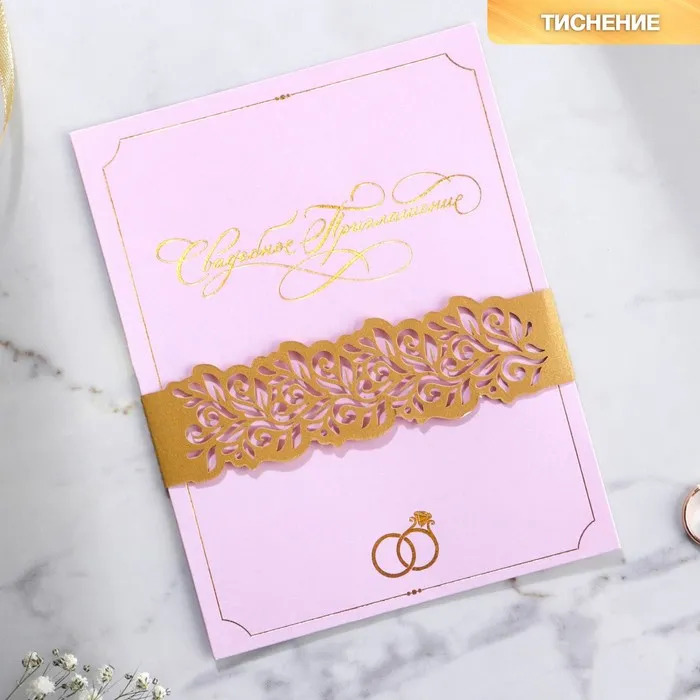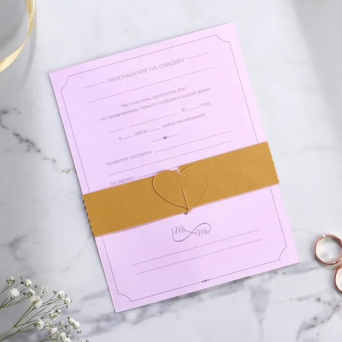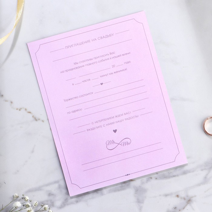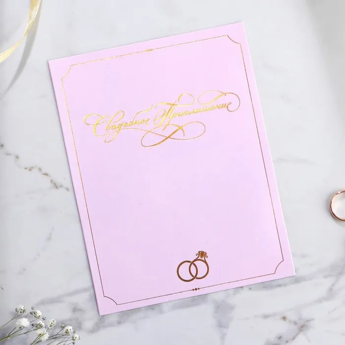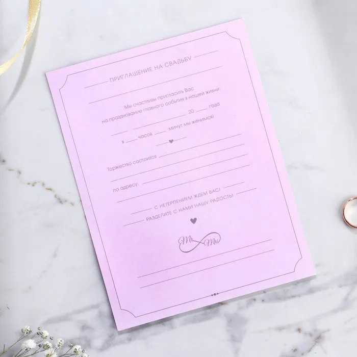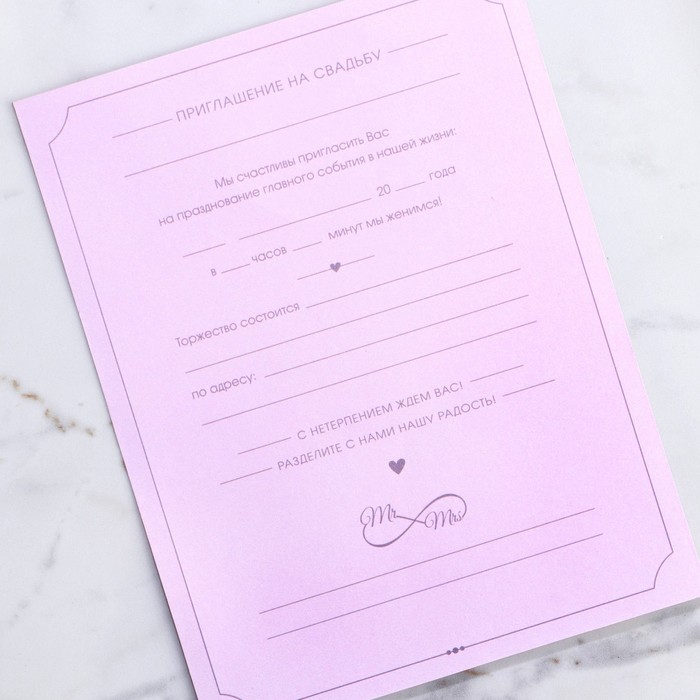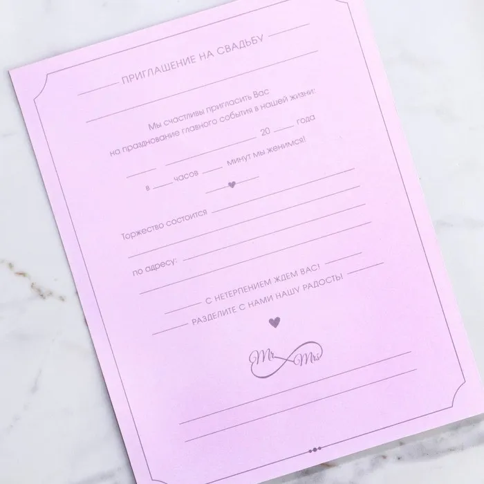 Когда дата и время бракосочетания уже известны, и вы определились со списком гостей, необходимо оповестить их о предстоящем празднике. Существует традиция делать персональные приглашения с указанием времени и даты мероприятия. Но перед свадьбой столько всего надо успеть, что на изготовление десятков открыток просто не остаётся времени. В этом случае вам придёт на помощь уникальное приглашение. Изделие выполнено из картона плотностью 250 грамм.Текст приглашения содержит свободные поля для имени адресата, времени, даты и адреса проведения мероприятия. Это потрясающее приглашение достойно стать частью такого важного события в жизни, как свадьба!