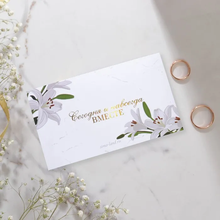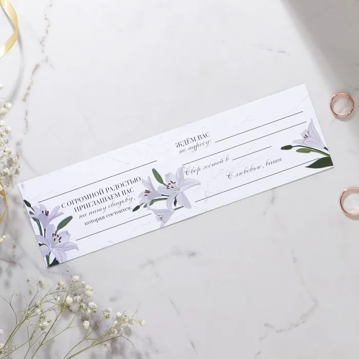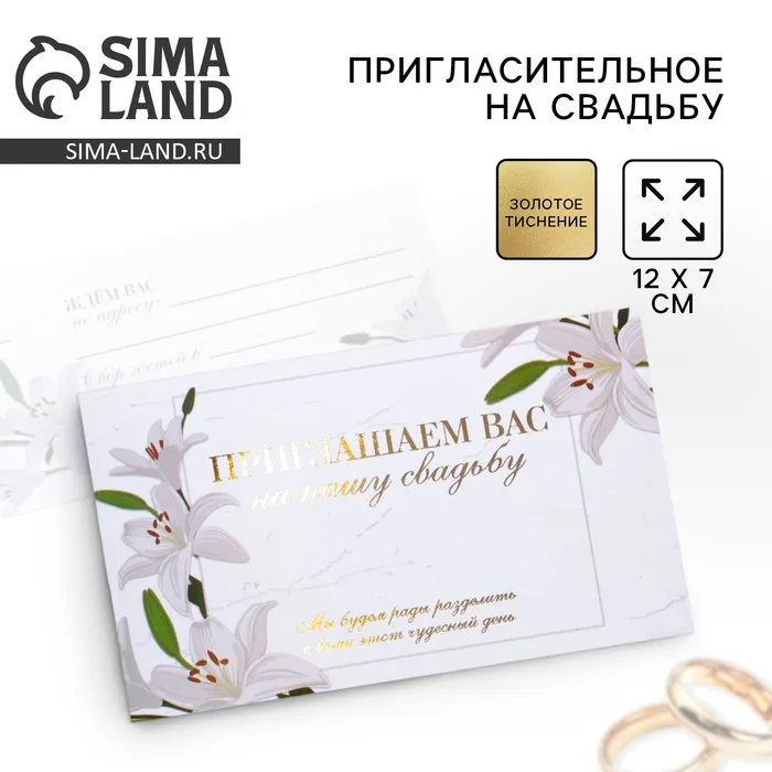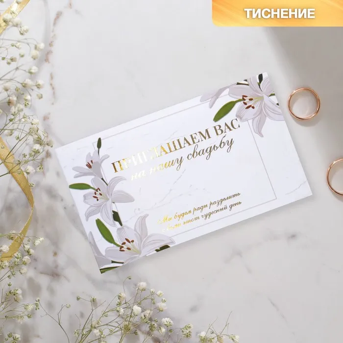 Когда дата и время бракосочетания уже известны, и вы определились со списком гостей, необходимо оповестить их о предстоящем празднике. Существует традиция делать персональные приглашения с указанием времени и даты мероприятия. Но перед свадьбой столько всего надо успеть, что на изготовление десятков открыток просто не остаётся времени. В этом случае вам придёт на помощь уникальное приглашение. Изделие выполнено из мелованной бумаги плотностью 200 грамм и дополнено тиснением. Это придаёт дорогой и роскошный вид. Текст приглашения содержит свободные поля для имени адресата, времени, даты и адреса проведения мероприятия. Это потрясающее приглашение достойно стать частью такого важного события в жизни, как свадьба!