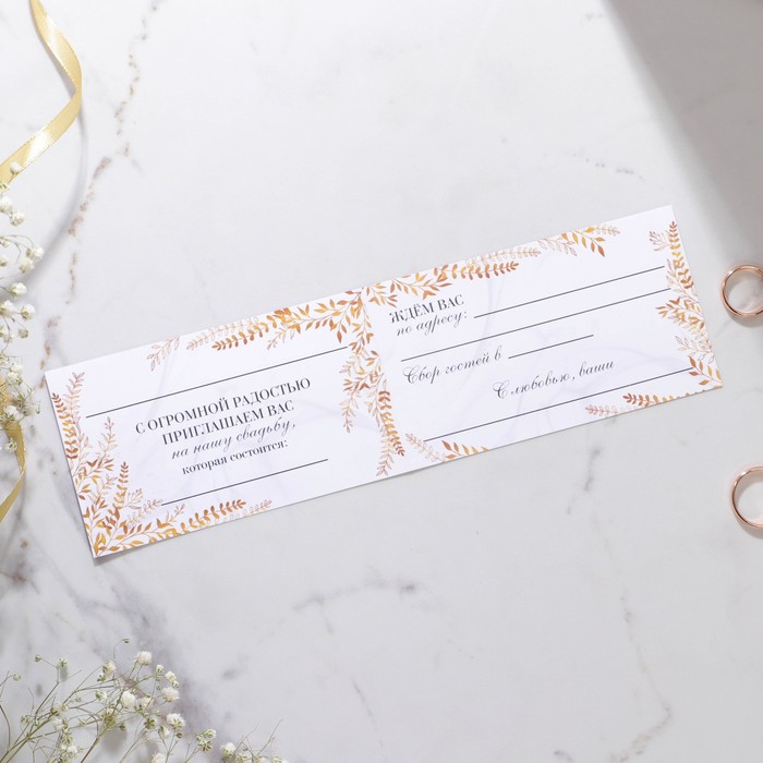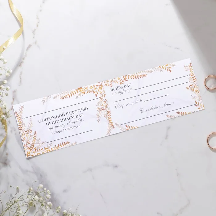 Когда дата и время бракосочетания уже известны, и вы определились со списком гостей, необходимо оповестить их о предстоящем празднике. Существует традиция делать персональные приглашения с указанием времени и даты мероприятия. Но перед свадьбой столько всего надо успеть, что на изготовление десятков открыток просто не остаётся времени. В этом случае вам придёт на помощь уникальное приглашение. Изделие выполнено из мелованной бумаги плотностью 200 грамм и дополнено тиснением. Это придаёт дорогой и роскошный вид. Текст приглашения содержит свободные поля для имени адресата, времени, даты и адреса проведения мероприятия. Это потрясающее приглашение достойно стать частью такого важного события в жизни, как свадьба!