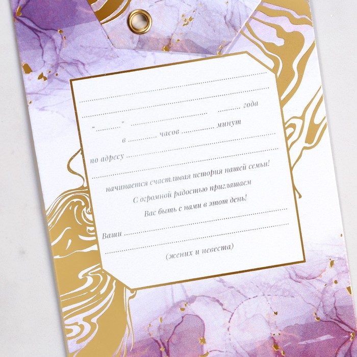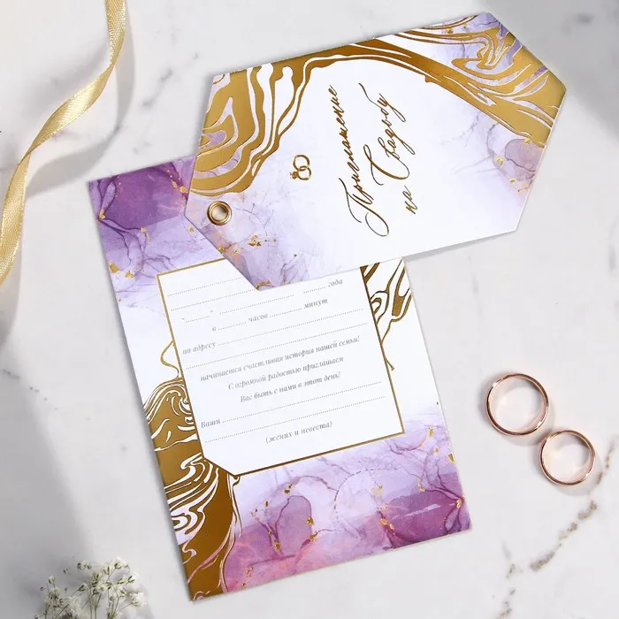 Когда дата и время бракосочетания уже известны, и вы определились со списком гостей, необходимо оповестить их о предстоящем празднике. Существует традиция делать персональные приглашения с указанием времени и даты мероприятия. Но перед свадьбой столько всего надо успеть, что на изготовление десятков открыток просто не остаётся времени. В этом случае вам придёт на помощь уникальное приглашение. Изделие выполнено из картона плотностью 250 грамм и дополнено тиснением. Это придаёт дорогой и роскошный вид. Текст приглашения содержит свободные поля для имени адресата, времени, даты и адреса проведения мероприятия. Это потрясающее приглашение достойно стать частью такого важного события в жизни, как свадьба!