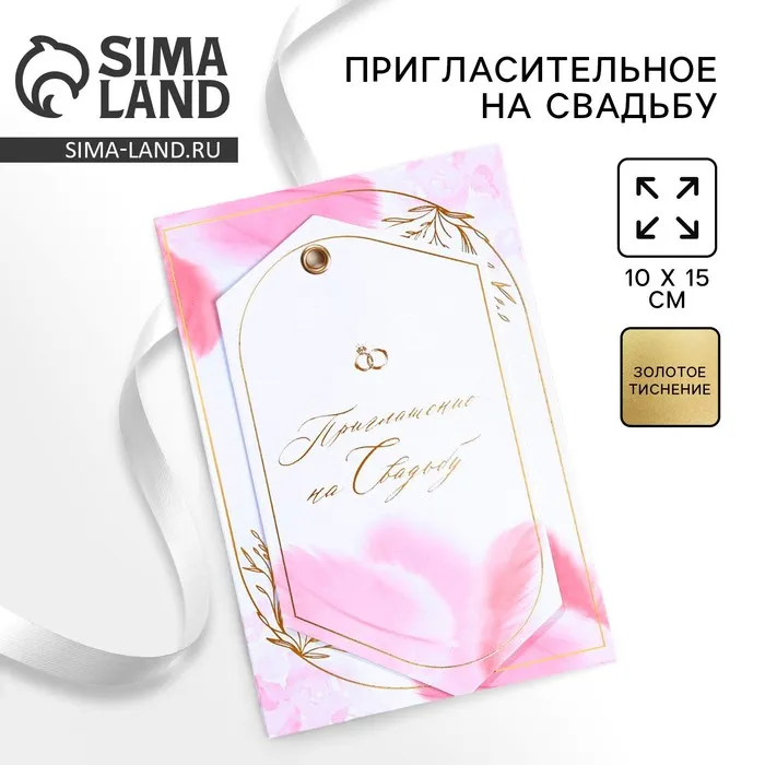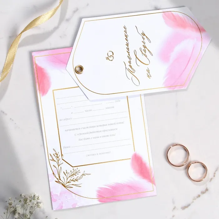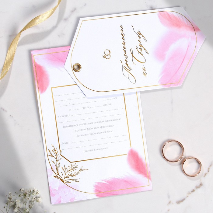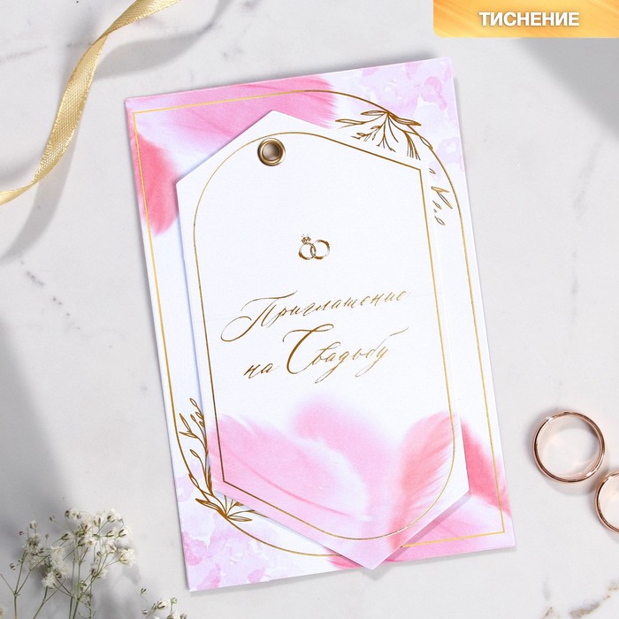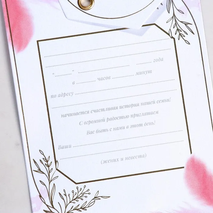 Когда дата и время бракосочетания уже известны, и вы определились со списком гостей, необходимо оповестить их о предстоящем празднике. Существует традиция делать персональные приглашения с указанием времени и даты мероприятия. Но перед свадьбой столько всего надо успеть, что на изготовление десятков открыток просто не остаётся времени. В этом случае вам придёт на помощь уникальное приглашение. Изделие выполнено из картона плотностью 250 грамм и дополнено тиснением. Это придаёт дорогой и роскошный вид. Текст приглашения содержит свободные поля для имени адресата, времени, даты и адреса проведения мероприятия. Это потрясающее приглашение достойно стать частью такого важного события в жизни, как свадьба!