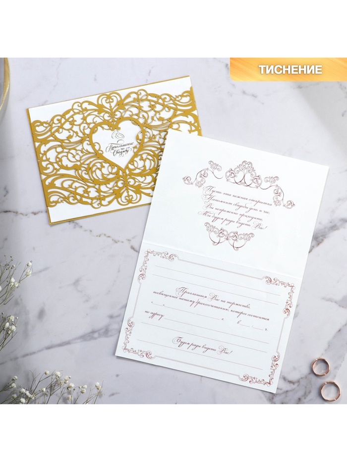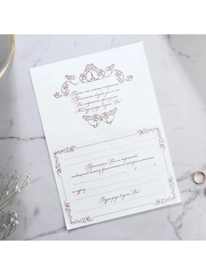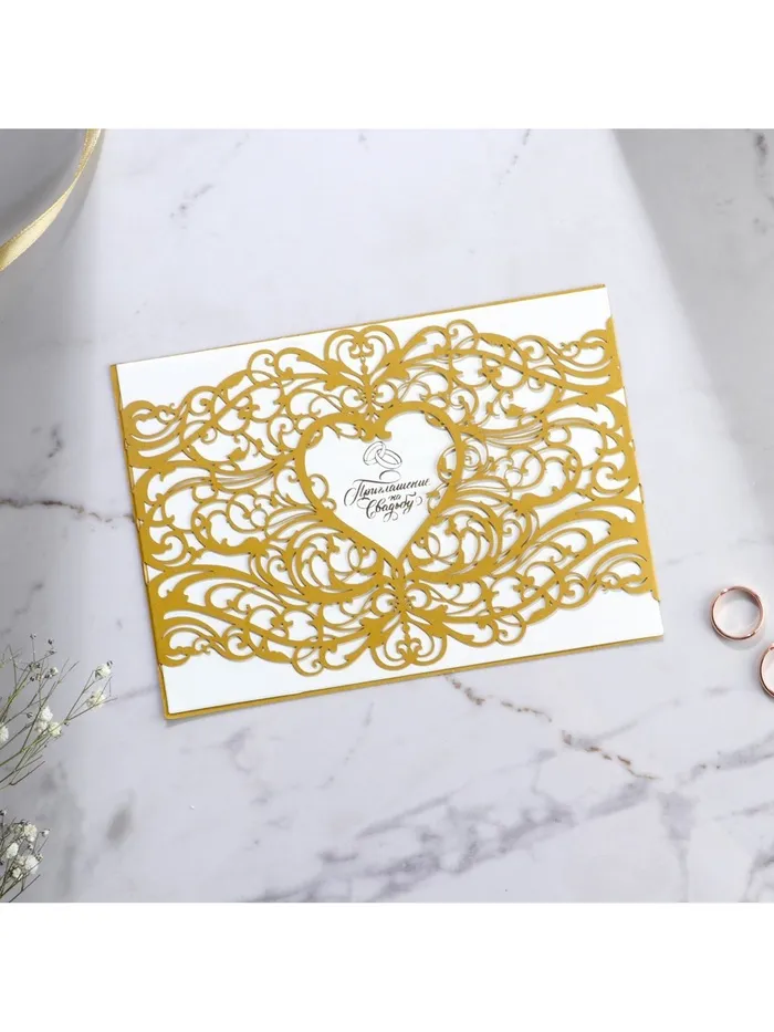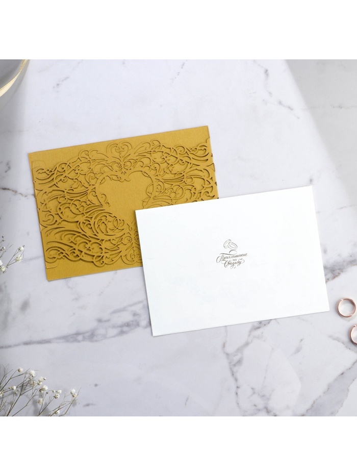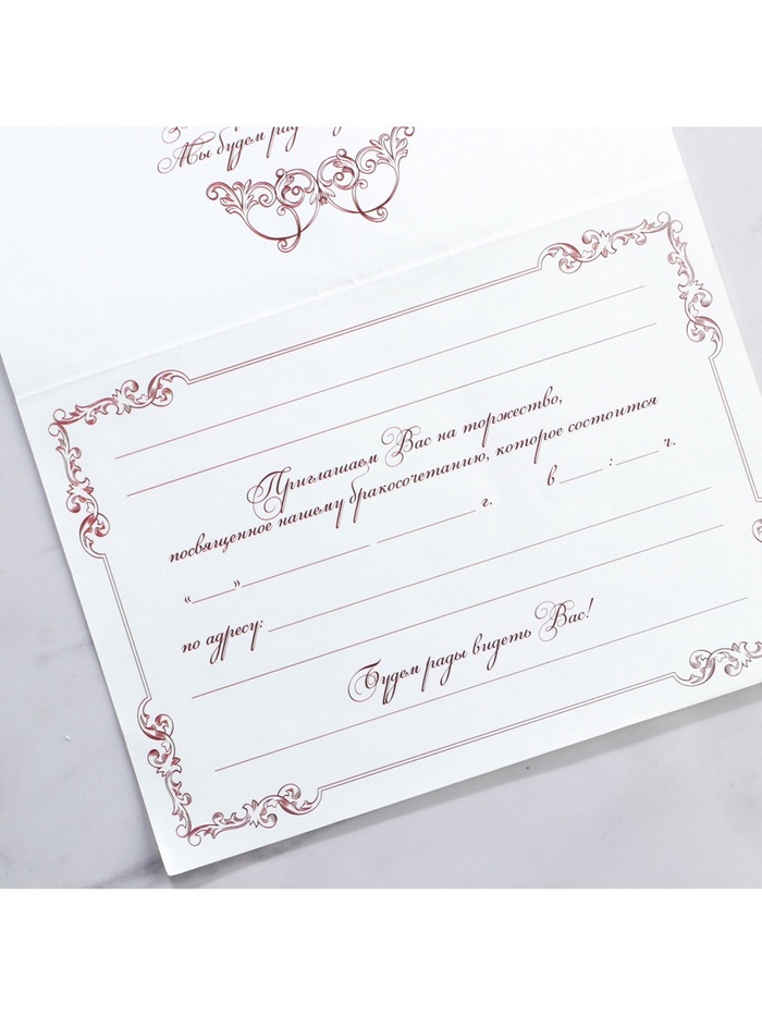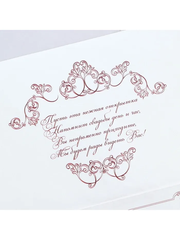 Когда дата и время бракосочетания уже известны, и вы определились со списком гостей, необходимо оповестить их о предстоящем празднике. Существует традиция делать персональные приглашения с указанием времени и даты мероприятия. Но перед свадьбой столько всего надо успеть, что на изготовление десятков открыток просто не остаётся времени. В этом случае вам придёт на помощь уникальное приглашение. Конверт выполнен из жемчужной бумаги плотностью 250 грамм, вкладыш из офисной бумаги 120 грамм. Это придаёт дорогой и роскошный вид. Текст приглашения содержит свободные поля для имени адресата, времени, даты и адреса проведения мероприятия. Это потрясающее приглашение достойно стать частью такого важного события в жизни, как свадьба!