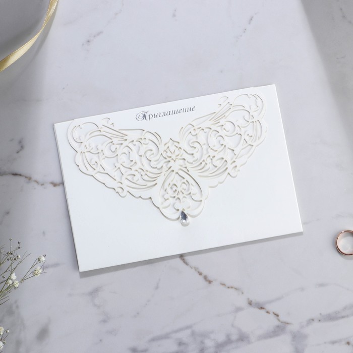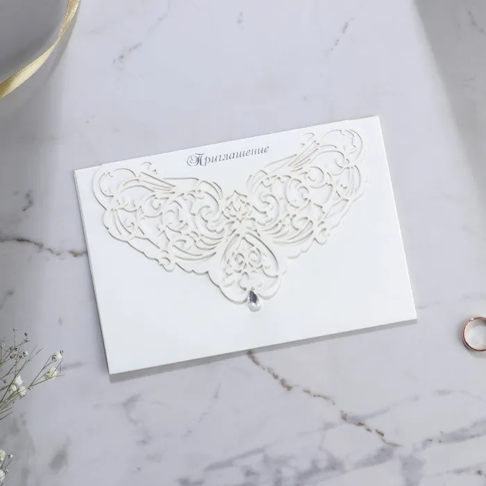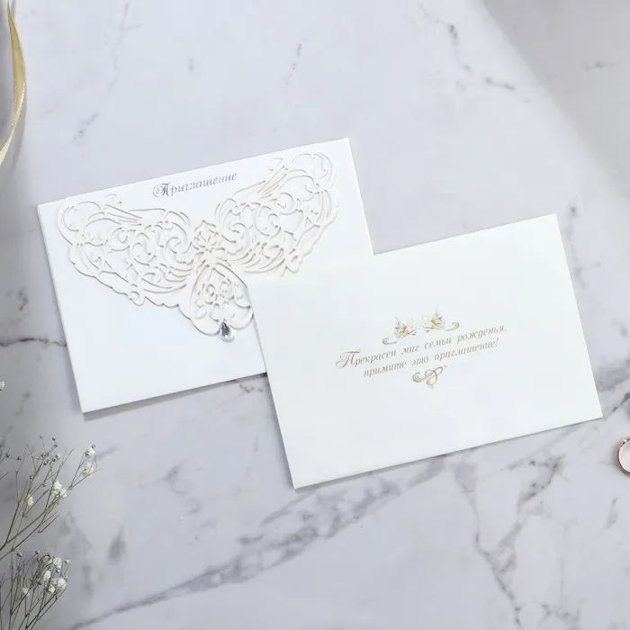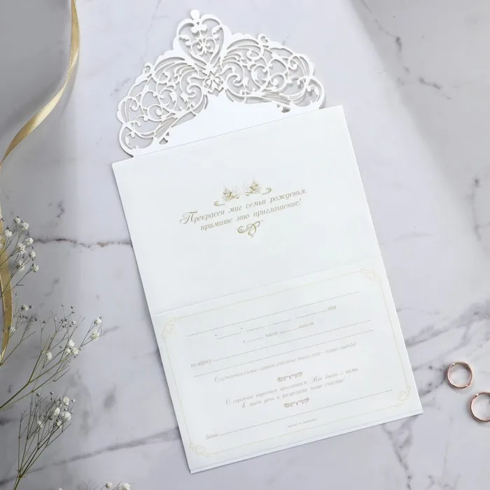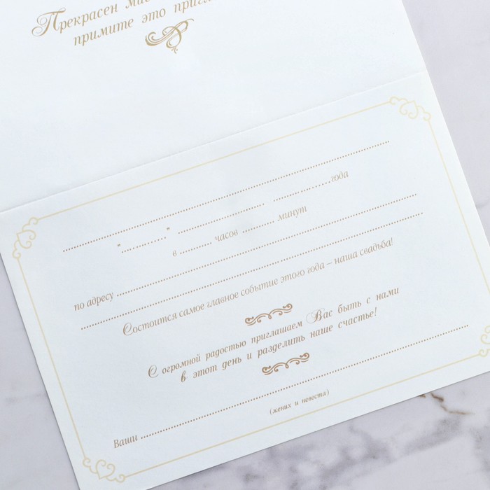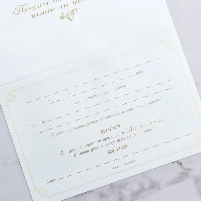 Когда дата и время бракосочетания уже известны, и вы определились со списком гостей, необходимо оповестить их о предстоящем празднике. Существует традиция делать персональные приглашения с указанием времени и даты мероприятия. Но перед свадьбой столько всего надо успеть, что на изготовление десятков открыток просто не остаётся времени. В этом случае вам придёт на помощь уникальное приглашение. Конверт выполнен из жемчужной бумаги плотностью 250 грамм, вкладыш из офисной бумаги 120 грамм. Это придаёт дорогой и роскошный вид. Текст приглашения содержит свободные поля для имени адресата, времени, даты и адреса проведения мероприятия. Это потрясающее приглашение достойно стать частью такого важного события в жизни, как свадьба!
