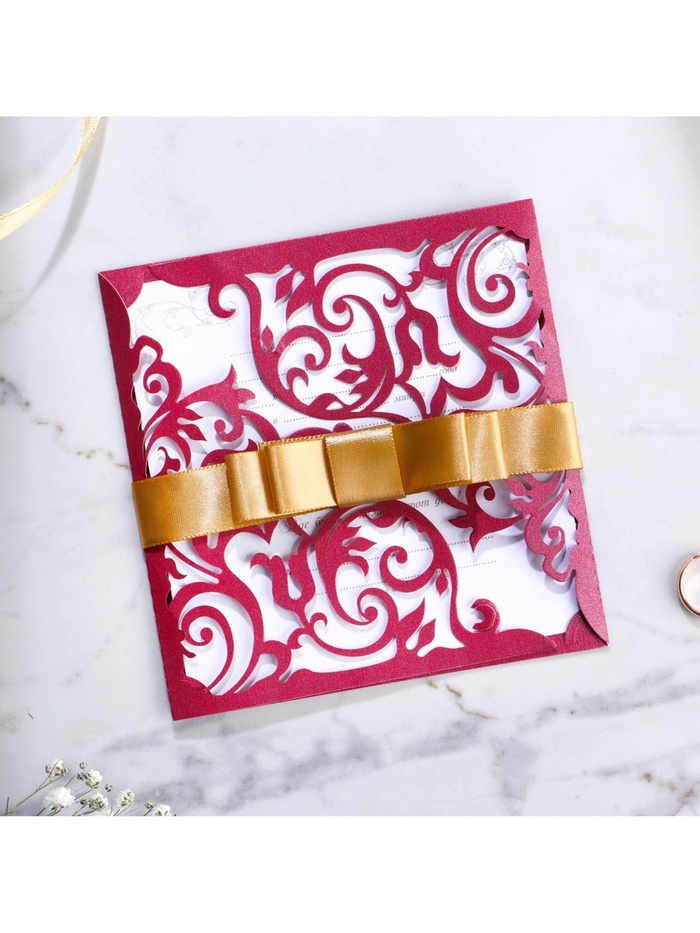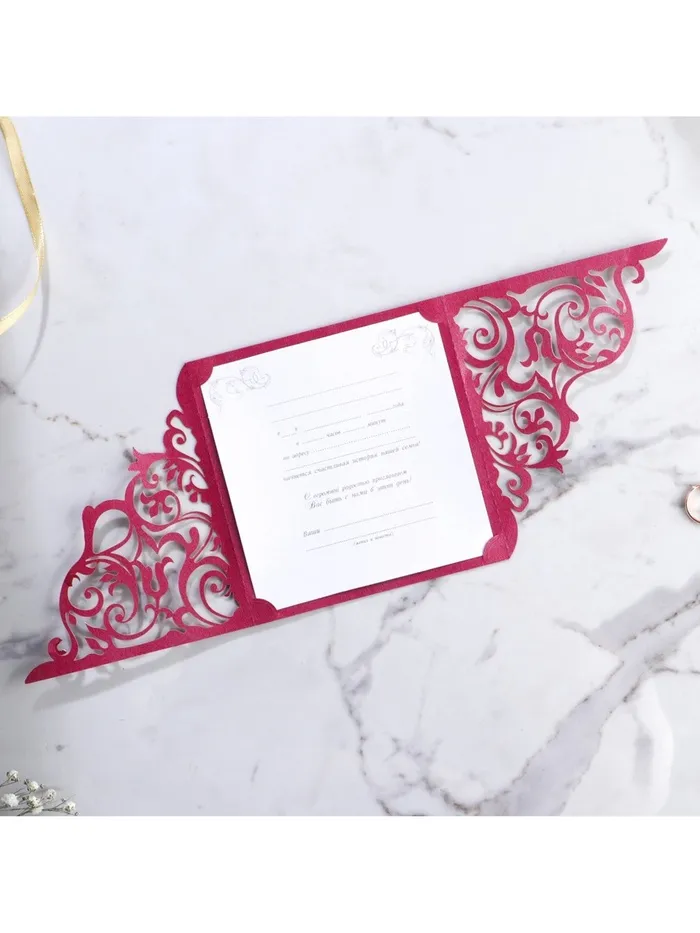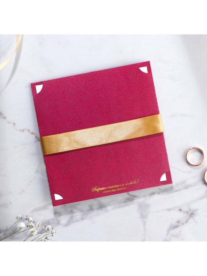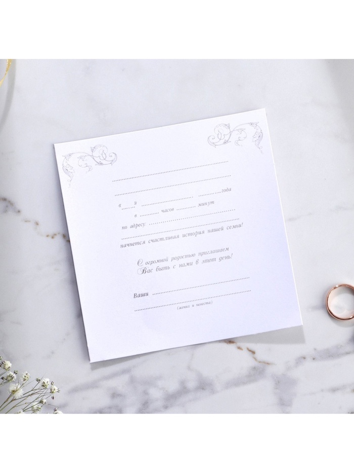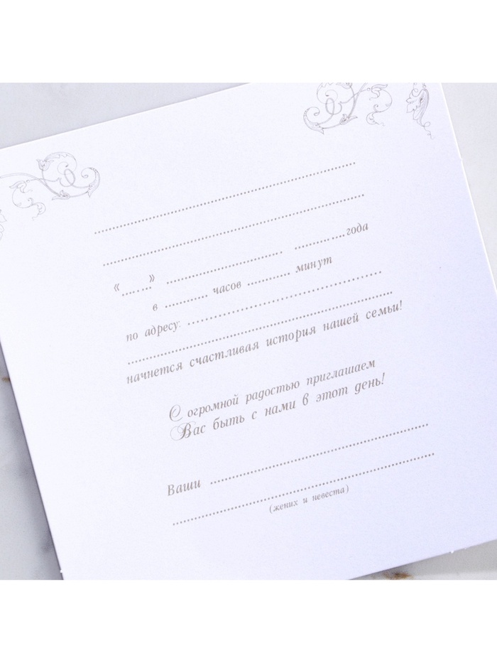Когда дата и время бракосочетания уже известны, и вы определились со списком гостей, необходимо оповестить их о предстоящем празднике. Существует традиция делать персональные приглашения с указанием времени и даты мероприятия. Но перед свадьбой столько всего надо успеть, что на изготовление десятков открыток просто не остаётся времени. В этом случае вам придёт на помощь уникальное приглашение. Конверт выполнен из жемчужной бумаги плотностью 250 грамм, вкладыш из офисной бумаги 120 грамм. Это придаёт дорогой и роскошный вид. Текст приглашения содержит свободные поля для имени адресата, времени, даты и адреса проведения мероприятия. Это потрясающее приглашение достойно стать частью такого важного события в жизни, как свадьба!