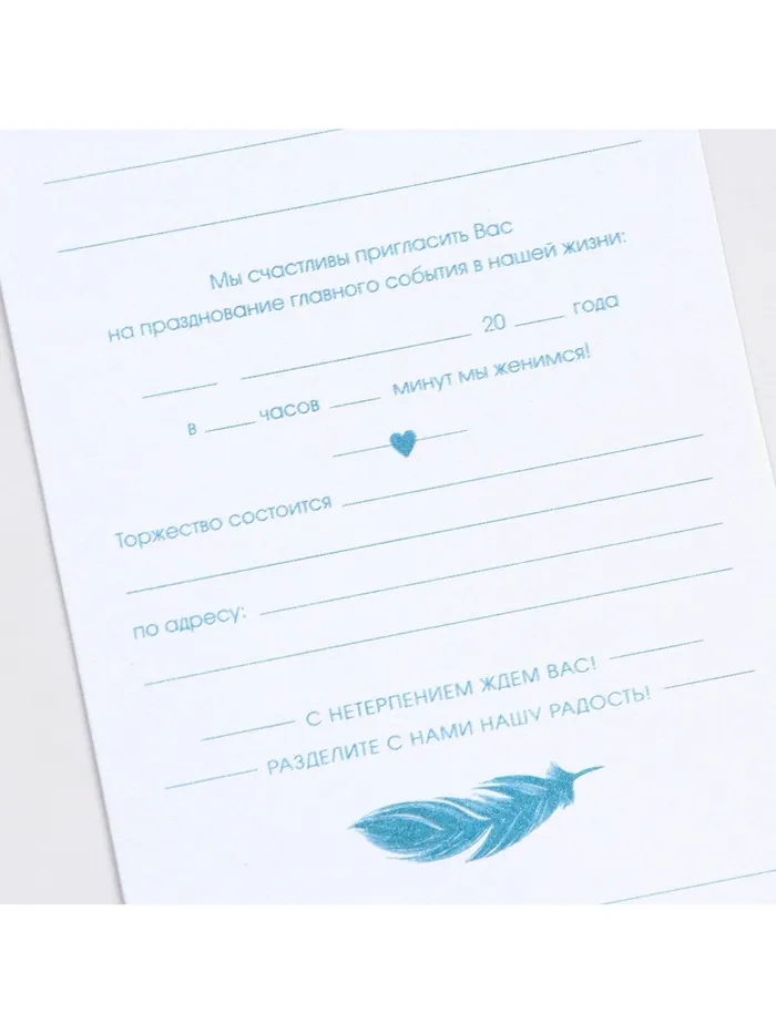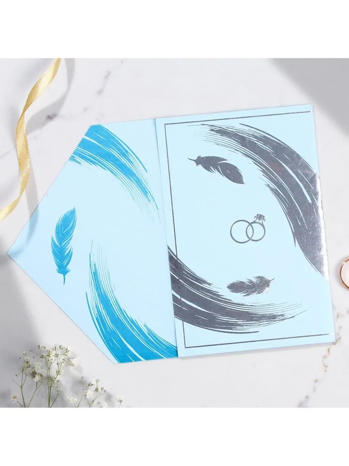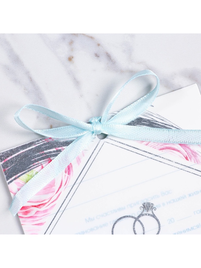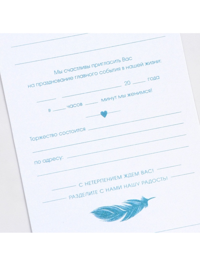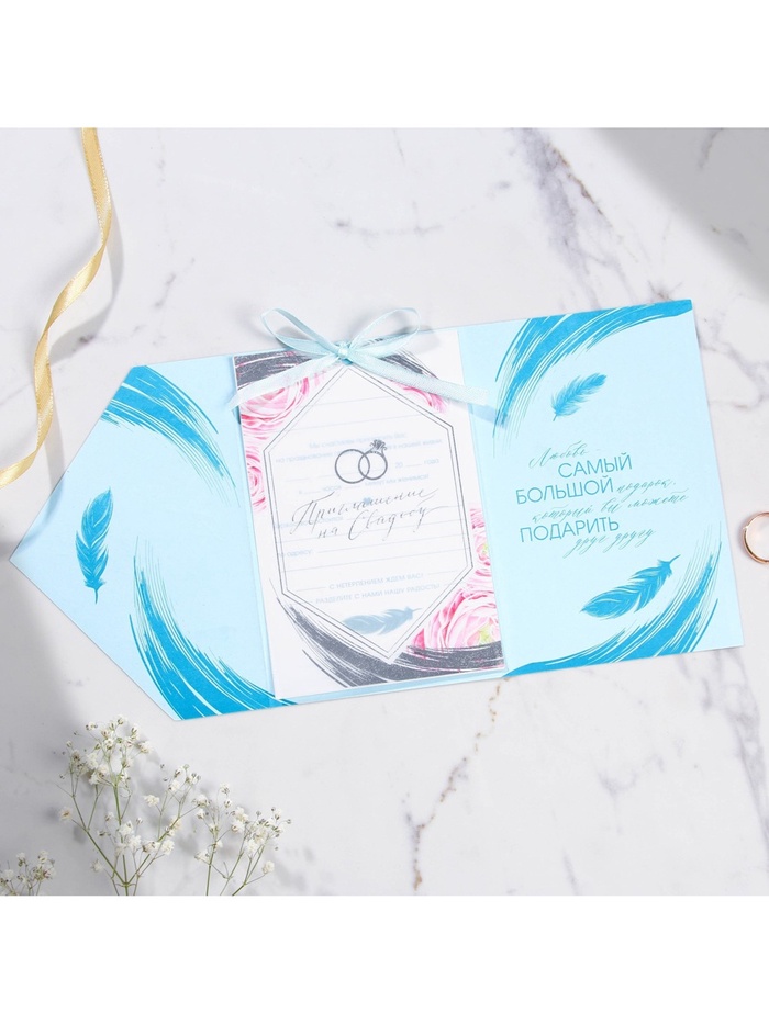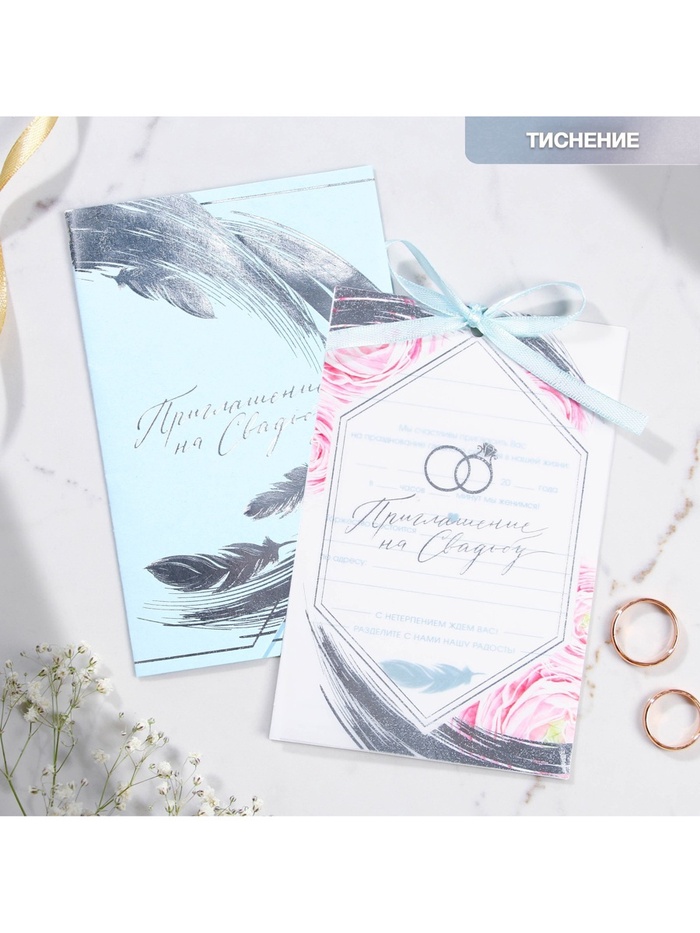 Когда дата и время бракосочетания уже известны, и вы определились со списком гостей, необходимо оповестить их о предстоящем празднике. Существует традиция делать персональные приглашения с указанием времени и даты мероприятия. Но перед свадьбой столько всего надо успеть, что на изготовление десятков открыток просто не остаётся времени. В этом случае вам придёт на помощь уникальное приглашение. Изделие выполнено из картона плотностью 250 грамм, калька плотностью 120 грамм, конверт из офисной бумаги плотностью 120 грамм и дополнено тиснением. Это придаёт дорогой и роскошный вид. Текст приглашения содержит свободные поля для имени адресата, времени, даты и адреса проведения мероприятия. Это потрясающее приглашение достойно стать частью такого важного события в жизни, как свадьба!