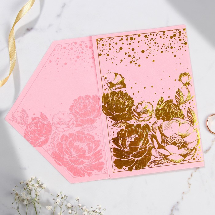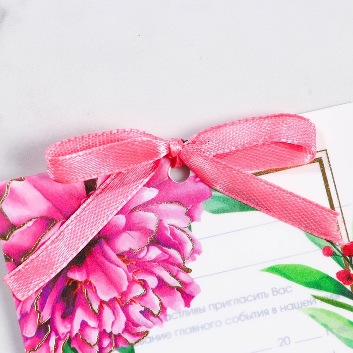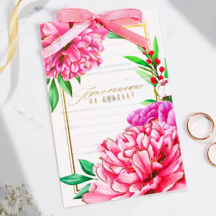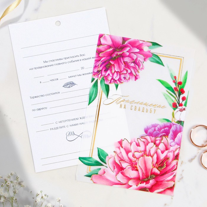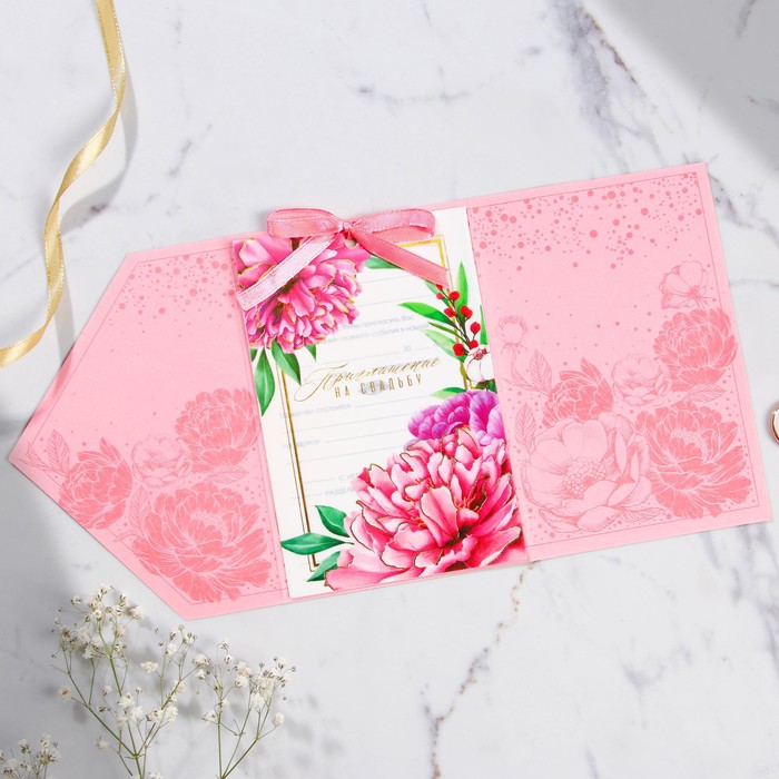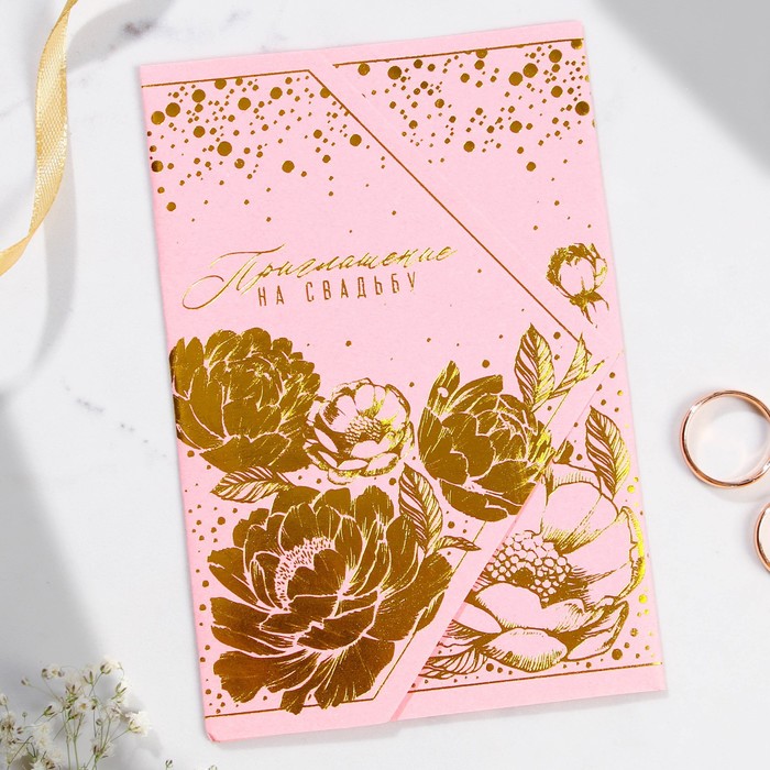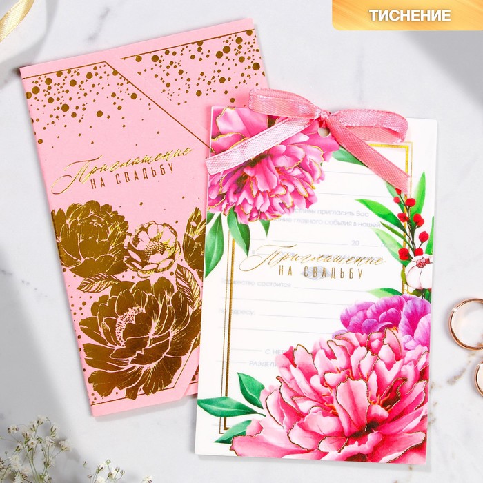 Когда дата и время бракосочетания уже известны, и вы определились со списком гостей, необходимо оповестить их о предстоящем празднике. Существует традиция делать персональные приглашения с указанием времени и даты мероприятия. Но перед свадьбой столько всего надо успеть, что на изготовление десятков открыток просто не остаётся времени. В этом случае вам придёт на помощь уникальное приглашение. Изделие выполнено из картона плотностью 250 грамм, калька плотностью 120 грамм, конверт из офисной бумаги плотностью 120 грамм и дополнено тиснением. Это придаёт дорогой и роскошный вид. Текст приглашения содержит свободные поля для имени адресата, времени, даты и адреса проведения мероприятия. Это потрясающее приглашение достойно стать частью такого важного события в жизни, как свадьба!