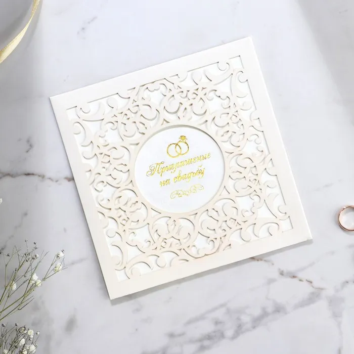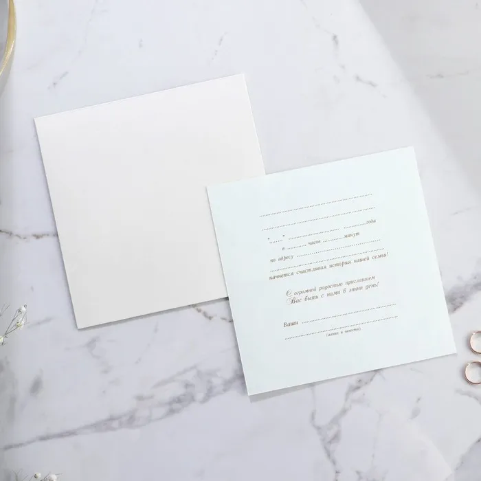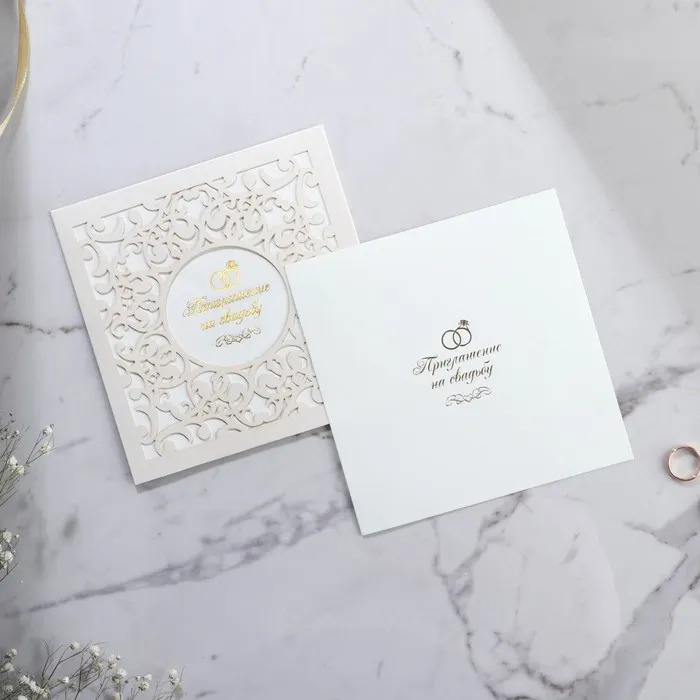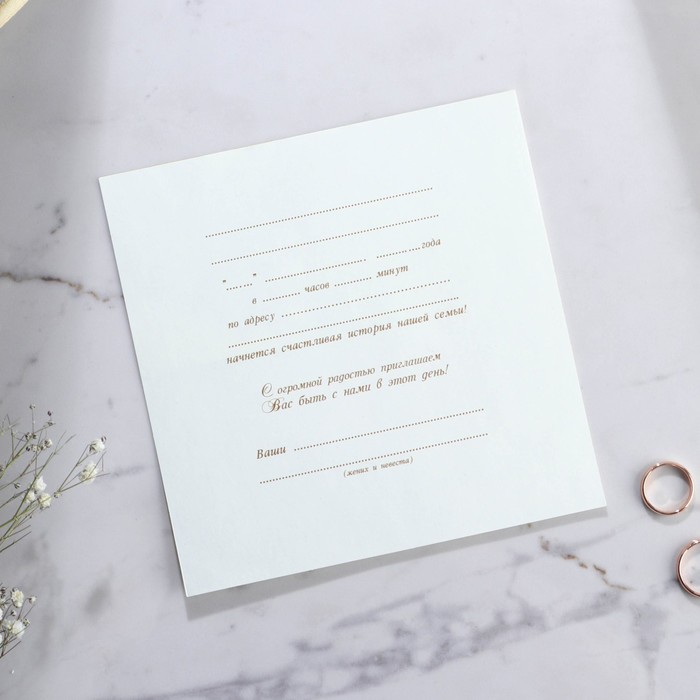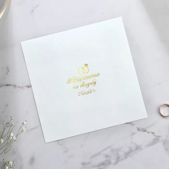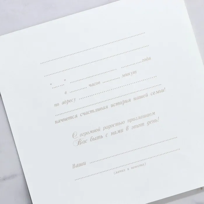 Когда дата и время бракосочетания уже известны, и вы определились со списком гостей, необходимо оповестить их о предстоящем празднике. Существует традиция делать персональные приглашения с указанием времени и даты мероприятия. Но перед свадьбой столько всего надо успеть, что на изготовление десятков открыток просто не остаётся времени. В этом случае вам придёт на помощь уникальное приглашение. Конверт выполнен из жемчужной бумаги плотностью 250 грамм, вкладыш из офисной бумаги 120 грамм. Это придаёт дорогой и роскошный вид. Текст приглашения содержит свободные поля для имени адресата, времени, даты и адреса проведения мероприятия. Это потрясающее приглашение достойно стать частью такого важного события в жизни, как свадьба!