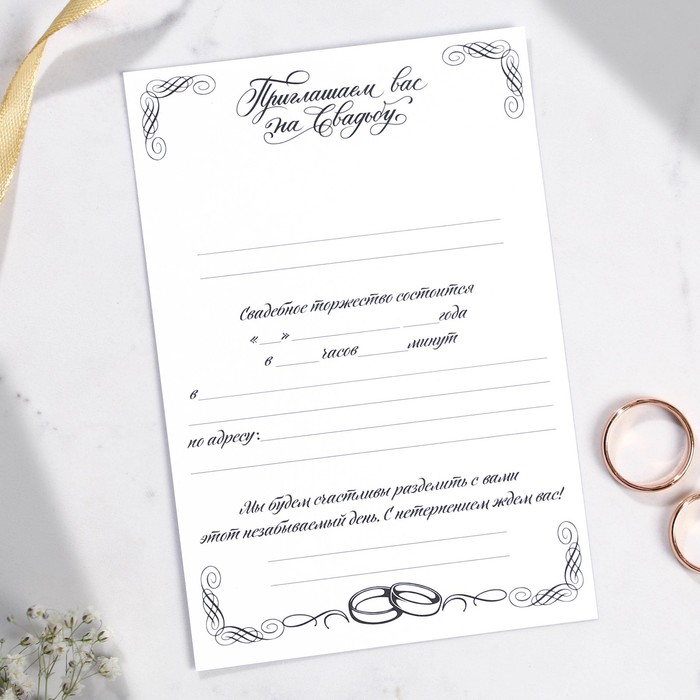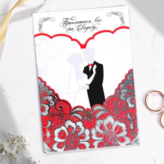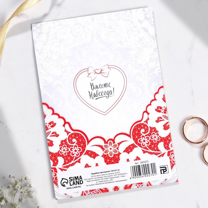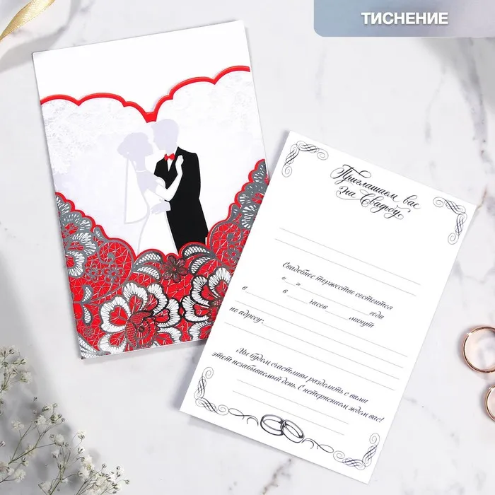 Когда дата и время бракосочетания уже известны, и вы определились со списком гостей, необходимо оповестить их о предстоящем празднике. Существует традиция делать персональные приглашения с указанием времени и даты мероприятия. Но перед свадьбой столько всего надо успеть, что на изготовление десятков открыток просто не остаётся времени. В этом случае вам придёт на помощь уникальное приглашение. Конверт выполнен из картона плотностью 250 грамм, вкладыш из бумаги плотностью 150 грамм. Текст приглашения содержит свободные поля для имени адресата, времени, даты и адреса проведения мероприятия. Это потрясающее приглашение достойно стать частью такого важного события в жизни, как свадьба!