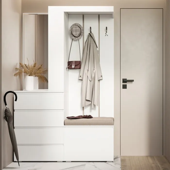 - Дизайн прихожей, сочетает в себе основной цвет: Белый.