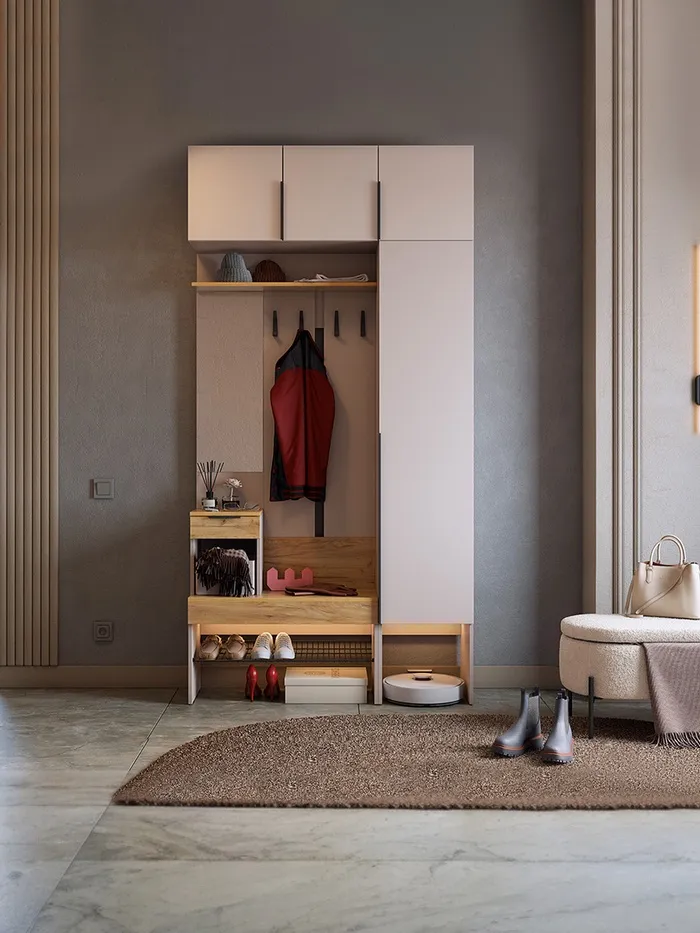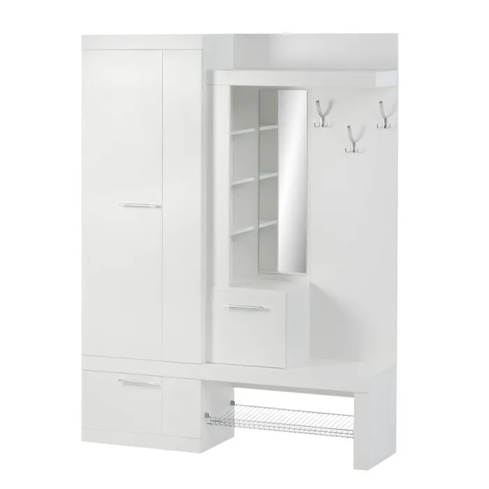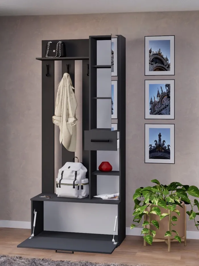 Компактная, но продуманная модель оптимально организует пространство вашей прихожей. Помимо классического функционала (место для верхней одежды и обуви), здесь предусмотрено специальное отделение для головных уборов и мелких деталей гардероба.