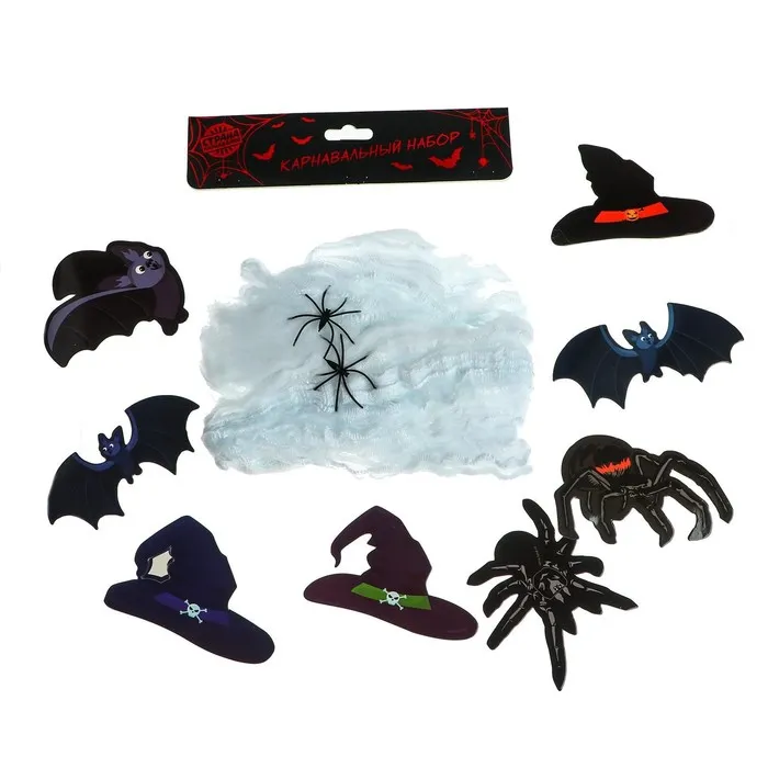 Карнавальный набор для создания праздничной атмосферы включает декоративные элементы в виде летучих мышей, пауков и паутины. Эти украшения помогут создать таинственную обстановку, идеально подходящую для тематических вечеринок и праздников. Паутина добавляет атмосферу загадочности и дополнит общий стиль декора.