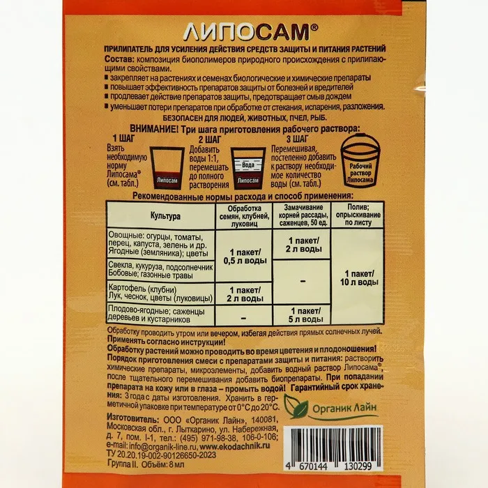 Прилипатель «Липосам», биоприлипатель, для лучшего прилипания средст защиты и питания, 8 мл — Характеристики