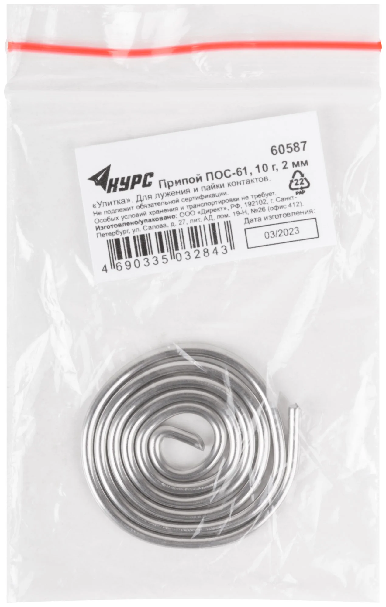 Изготовлен из высококачественного припоя ПОС 61, он обладает низкой температурой плавления в диапазоне 183-190°C, что делает его безопасным для использования с чувствительными компонентами. Компактный размер в формате "улитка" позволяет удобно хранить и транспортировать материал.
