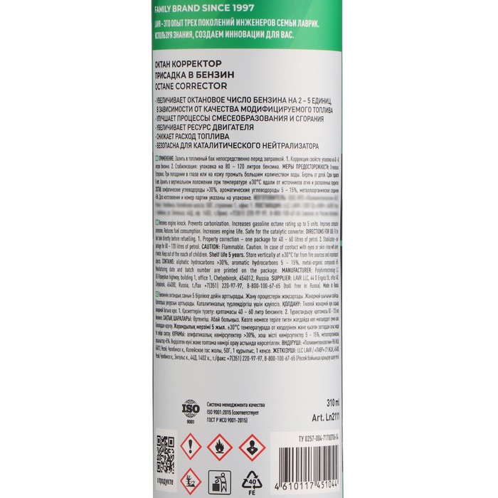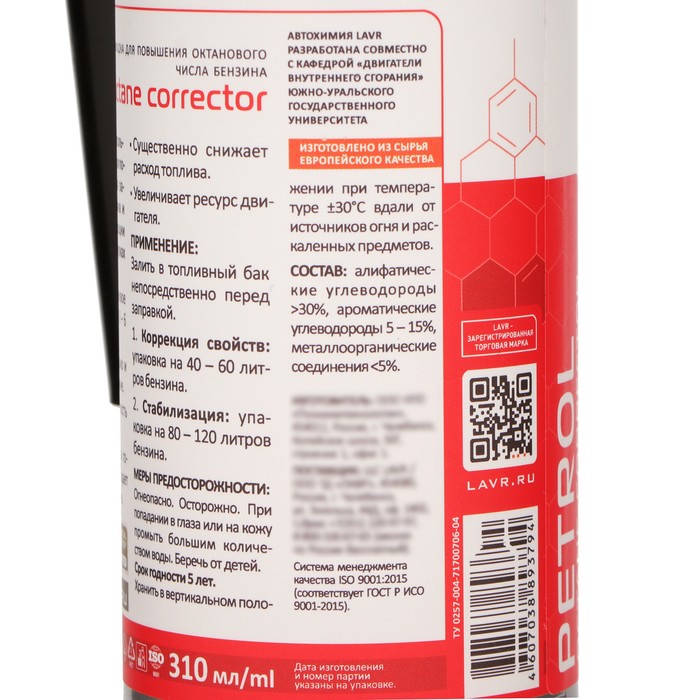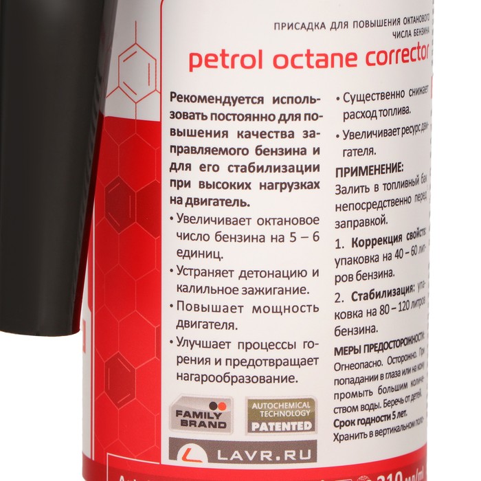 Присадка в бензин LAVR октан Плюс, на 40-60 л, 310 мл Ln2111 — Характеристики