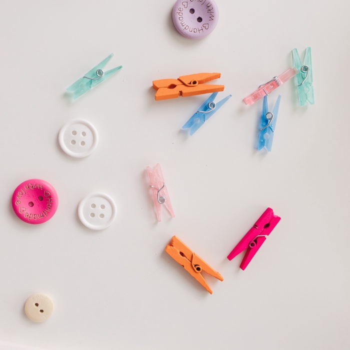 Небольшие пластиковые прищепки пригодятся, когда вам нужно будет зафиксировать ткань во время шитья. Они надёжно закрепят материал и не позволят ему смещаться во время работы. Станут отличной заменой булавкам: не зацепят и не порвут ткань. Также прищепки можно использовать в качестве декора или аксессуаров.