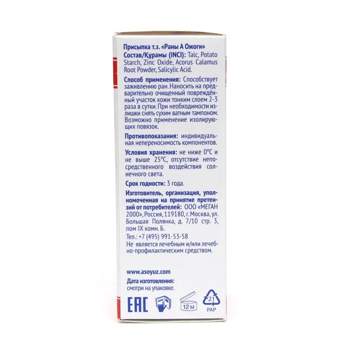 Состав: Тальк, картофельный крахмал, цинка оксид, порошок корня аира, салициловая кислота.