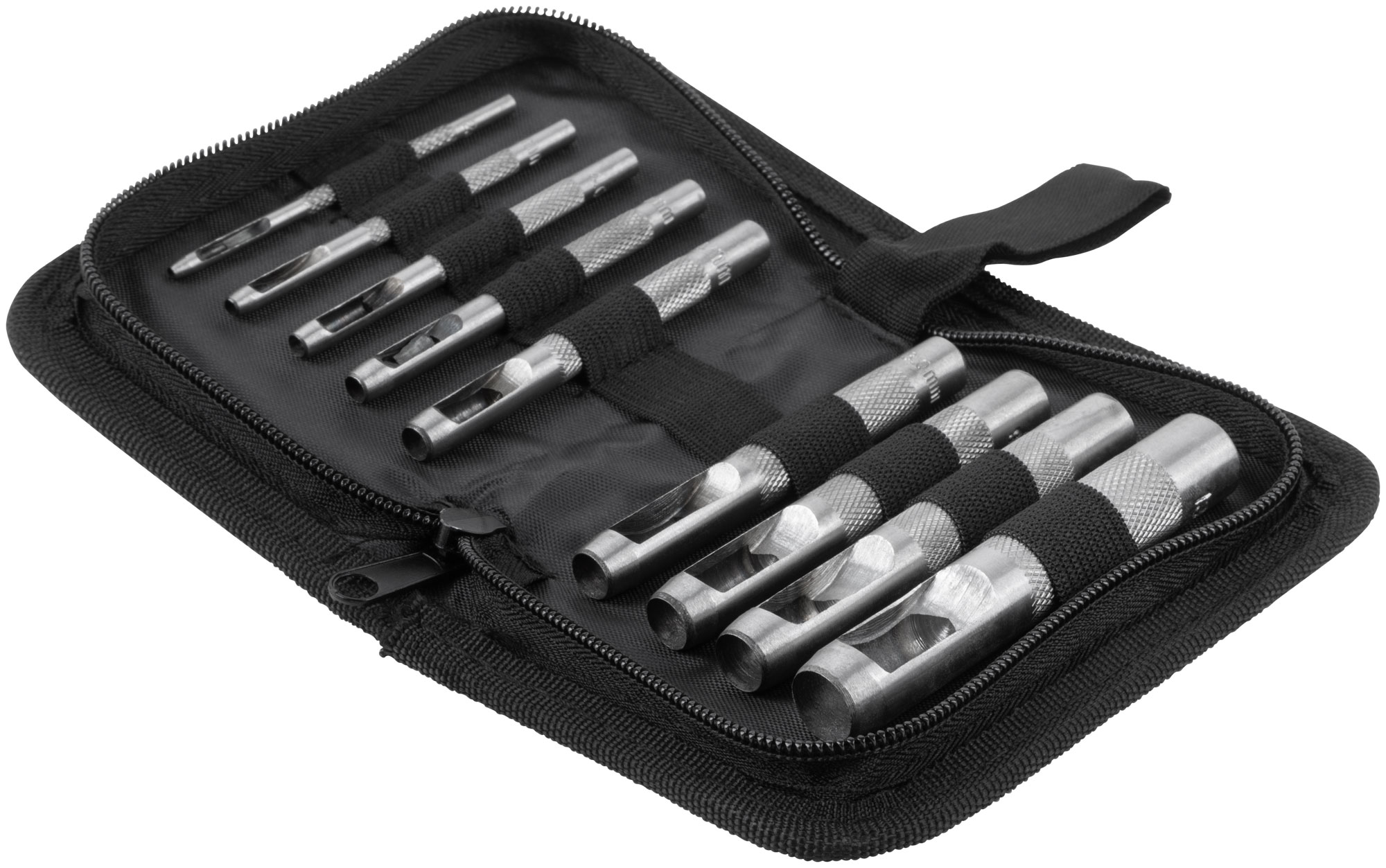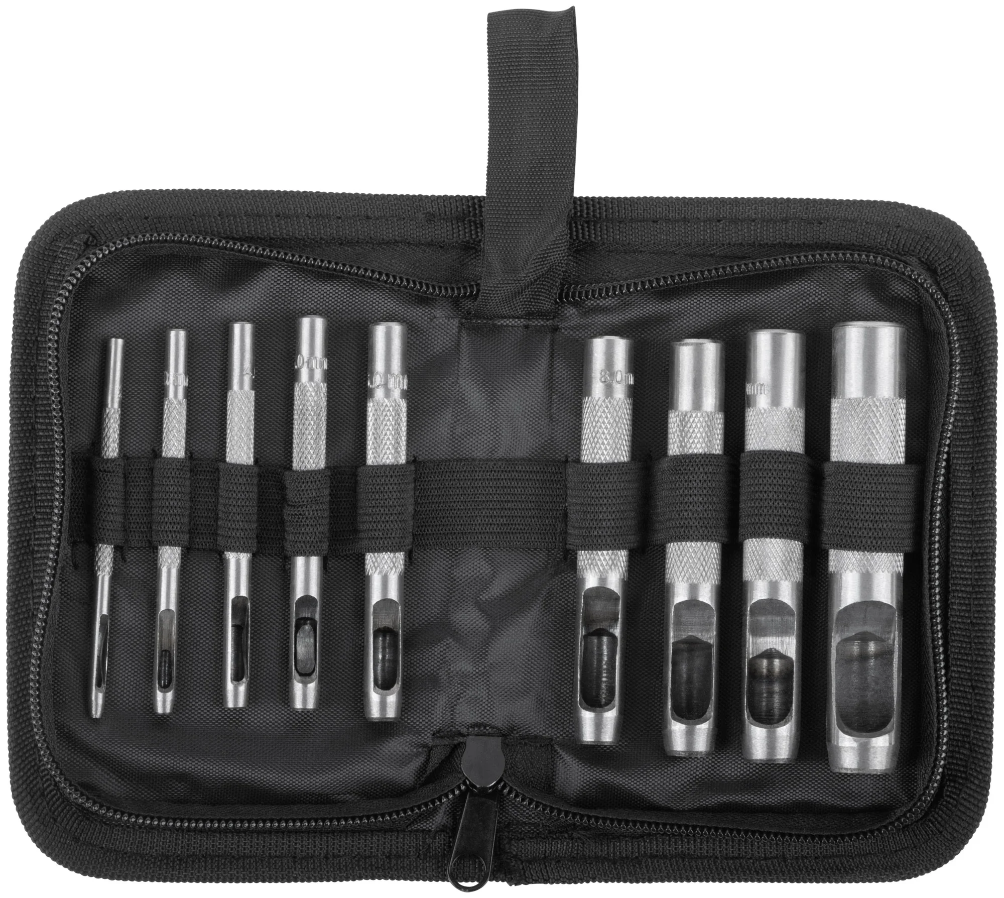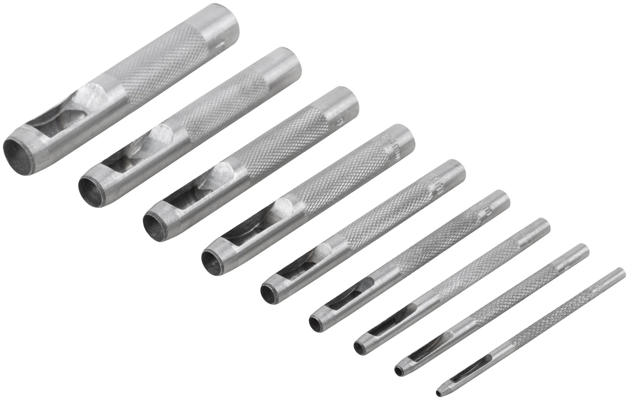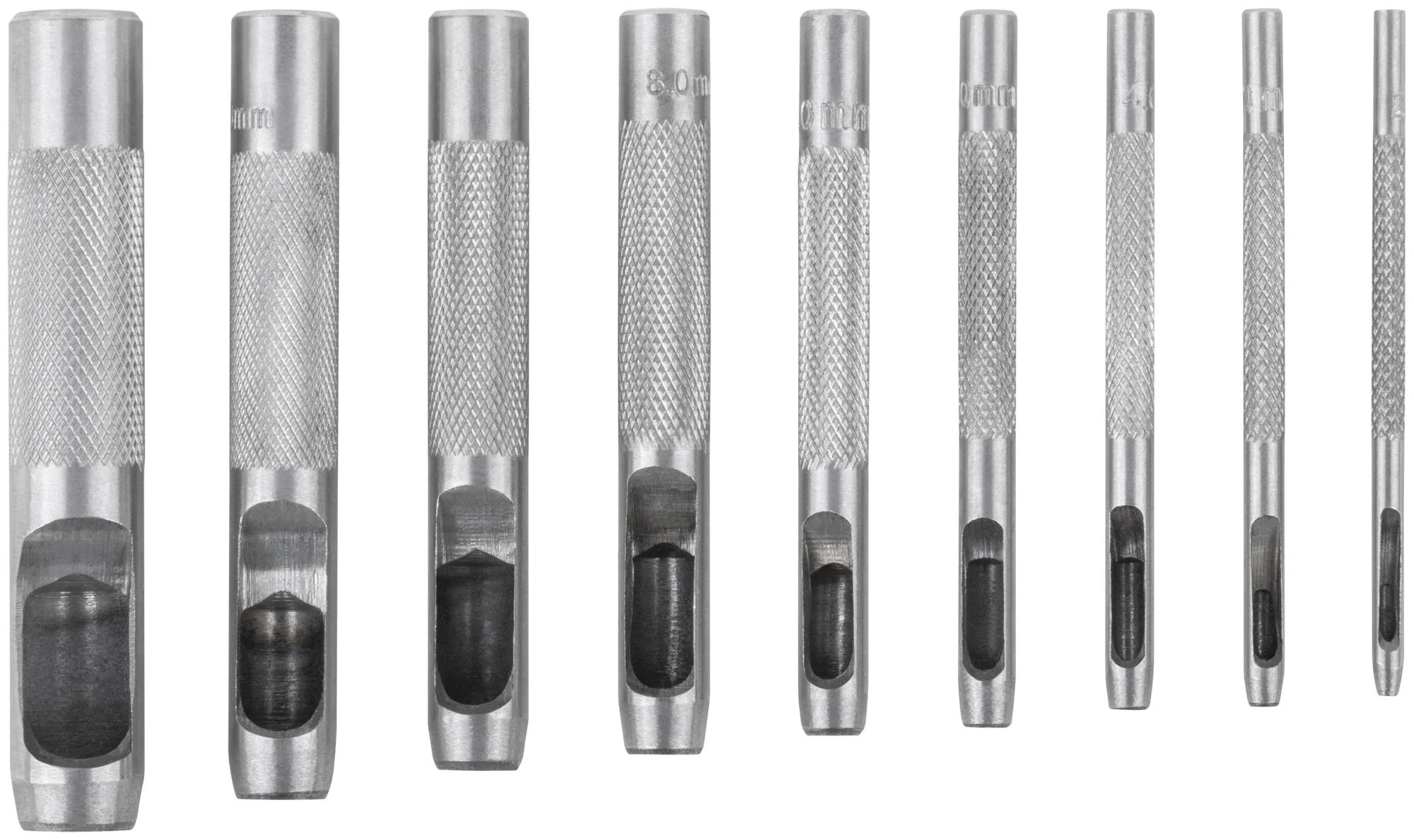 Каждый инструмент в этом наборе изготовлен из прочной инструментальной стали, что обеспечивает их долговечность и устойчивость к износу. Комплект включает 9 пробойников с диаметрами 2, 3, 4, 5, 6, 8, 9, 10 и 13 мм, что позволяет выбрать нужный размер для любой задачи.
