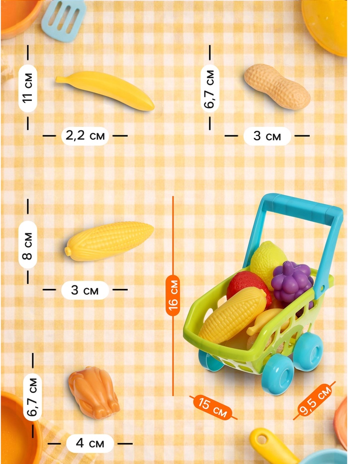 В набор входят 9 предметов — простые, лёгкие и удобные для маленьких рук. Тележка подходит как для игр дома, так и для прогулок: её легко катать, носить с собой и включать в любые игровые сюжеты.