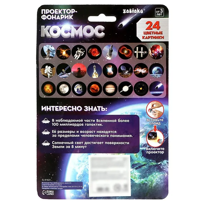 Проектор-фонарик «Космос», 3 слайда, 24 картинки, МИКС — Характеристики