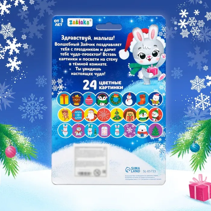 В набор входят: проектор-фонарик, 3 слайда (24 цветные картинки) и 12 светящихся в темноте снежинок.