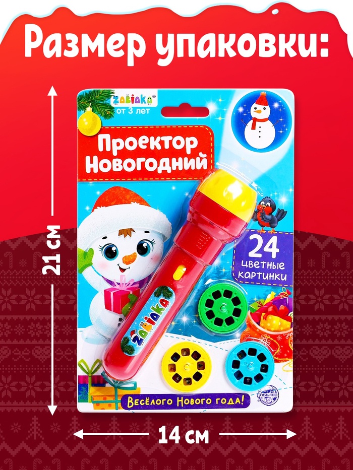 В набор входят: проектор-фонарик, 3 слайда (24 цветные картинки) и 12 светящихся в темноте снежинок.