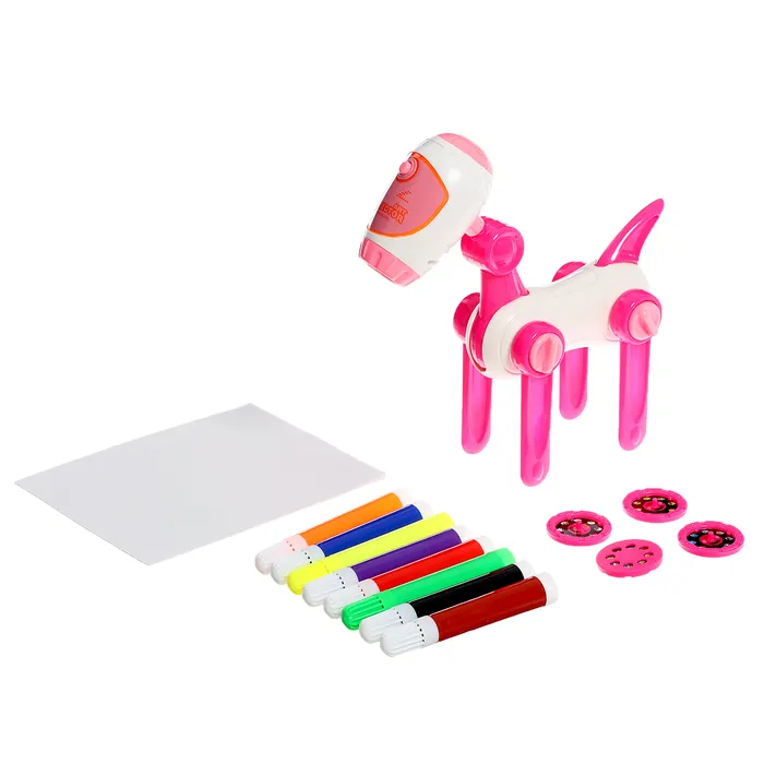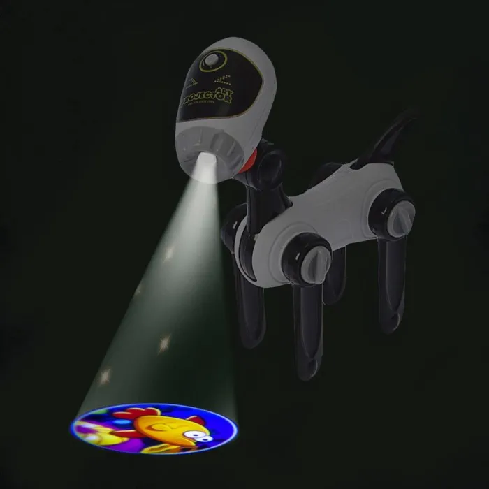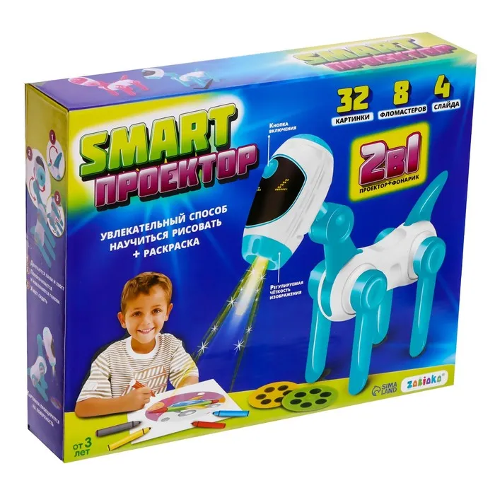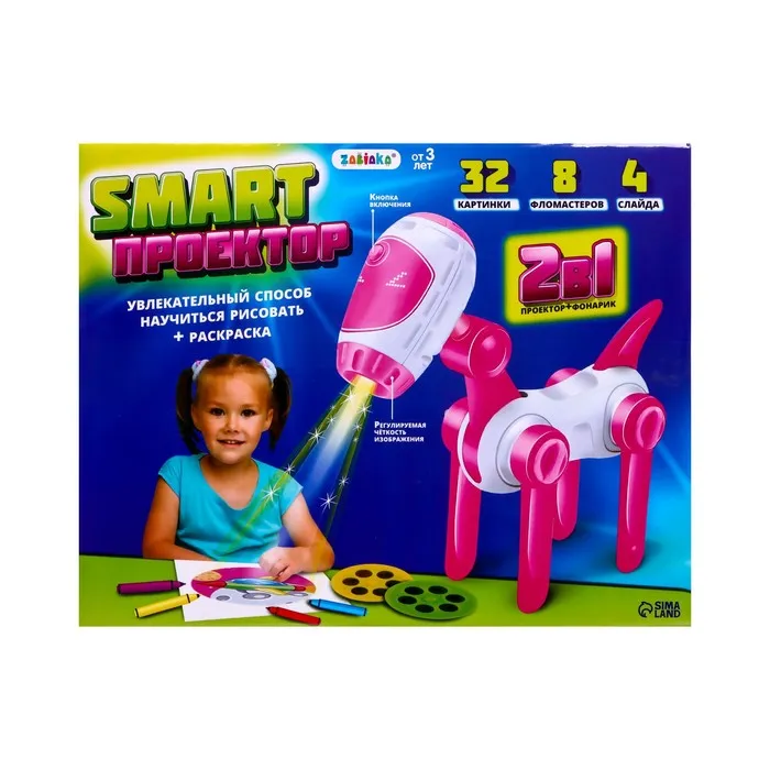 Данная игрушка — это проектор-лампа. Чтобы начать с ней работу, необходимо вставить в устройство 3 батарейки типа AG13 (входят в комплект), затем установить один из четырёх слайдов. Прибор перенесёт изображение на лист бумаги, а малыш с удовольствием раскрасит полученную картинку.