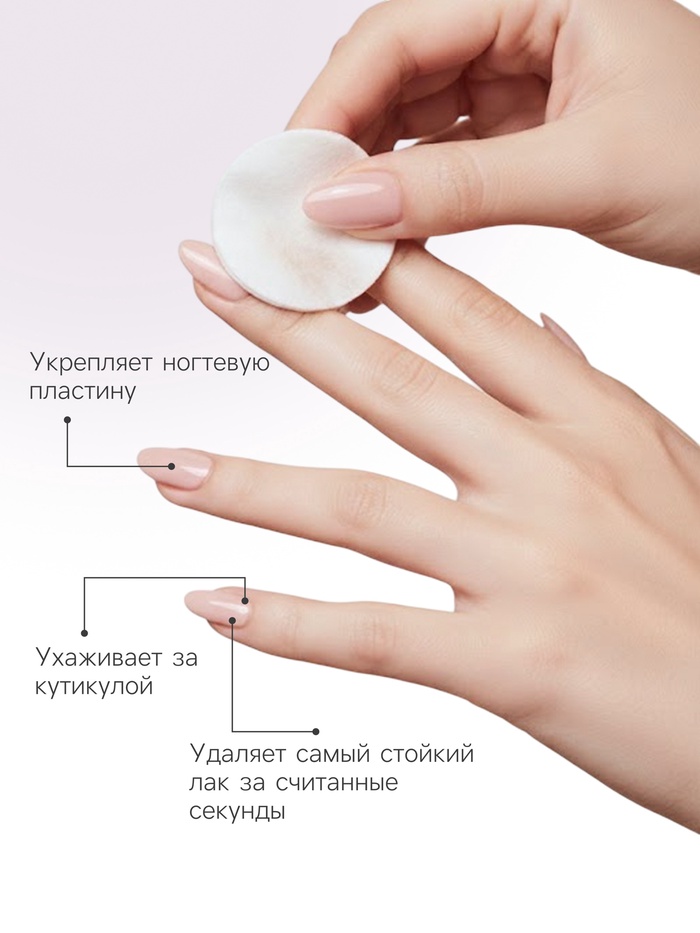 Мягко и эффективно удаляет лак, не повреждая структуру ногтя, способствуя уходу за ломкими и слоящимися ногтями.