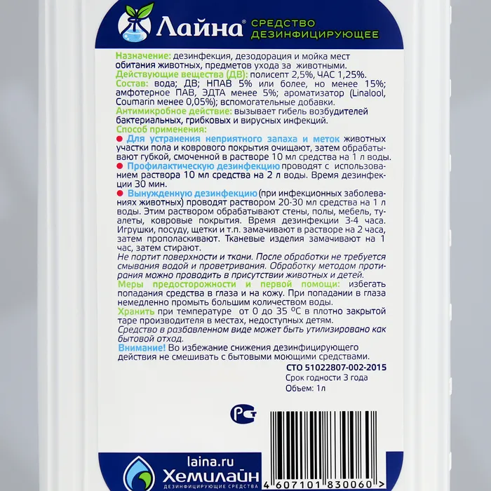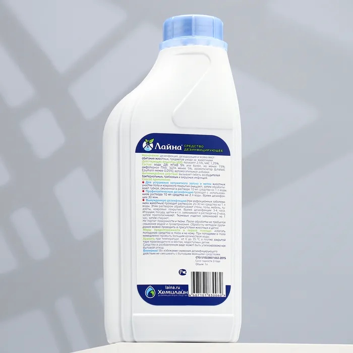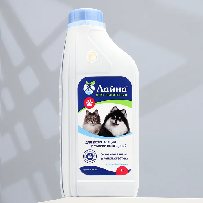 Профессиональное средство "Лайна" для дезинфекции и уборки помещений, 1 л.Обеззараживание, дезодорация и мойка мест обитания животных, предметов ухода за животными.Состав: полисепт, ЧАС, комплекс ПАВ, целевые добавки, вода.Уничтожает возбудителей кишечных, гнойных, грибковых, аденовирусных инфекций, обладает моющими свойствами, устраняет неприятные запахи, не портит поверхность.