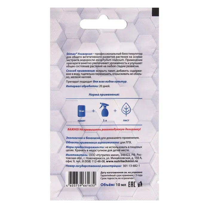 Профессиональный стимулятор роста и цветения. Stimax Универсал - уникальный продукт, обладающий широким спектром действия. Повышает стрессоустойчивость и усиливает иммунитет растения к внешним факторам. Может применяться на любой стадии развития растения. Позволяет растению максимально использовать внутренний потенциал и ресурсы окружающей среды. Улучшает общее состояние и повышает урожайность.