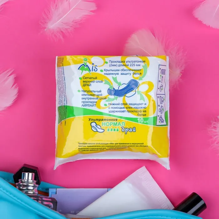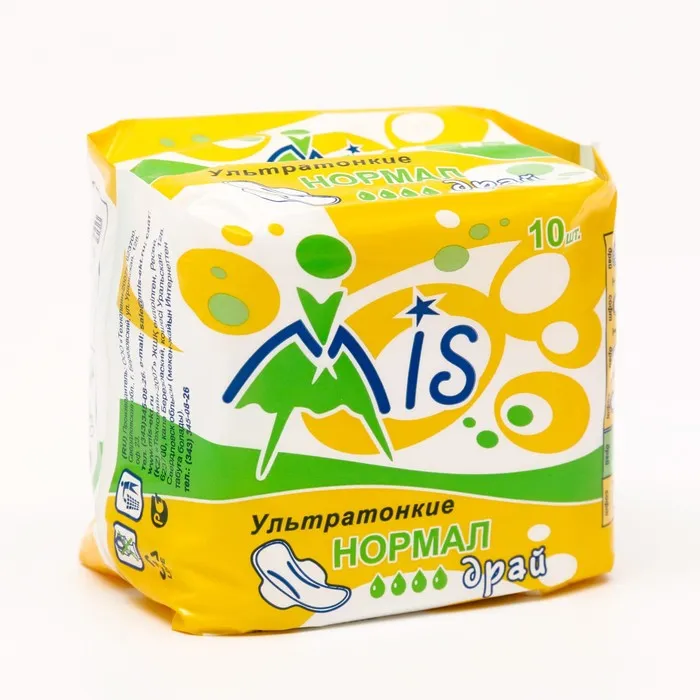 Описание: прокладки ""Mis"" Ультратонкие, Normal Dry, 10 шт Прокладки MIS ультратонкие (3 мм) нормал драй с боковыми крылышками, длиной 225 мм с внутренним впитывающим слоем «Аэрлайд», который надёжно впитывает жидкость, удерживая и превращая её в гель. Верхний слой драй – сеточка из тысяч воронкообразных отверстий, зауженных снизу, благодаря чему влага проникает вглубь прокладки, а её поверхность остаётся сухой. Мягкие крылышки служат надёжной защитой от протеканий и дополнительной фиксацией прокладки на белье.