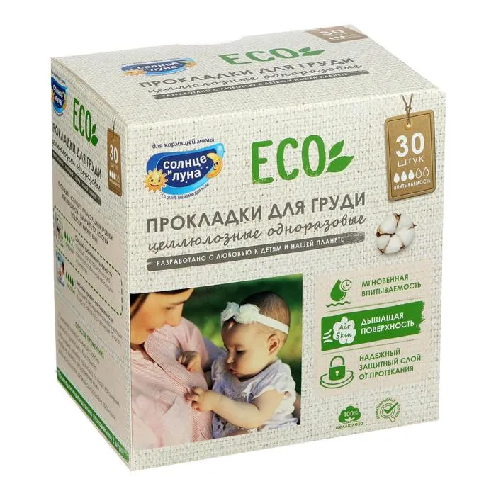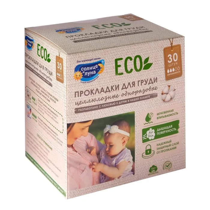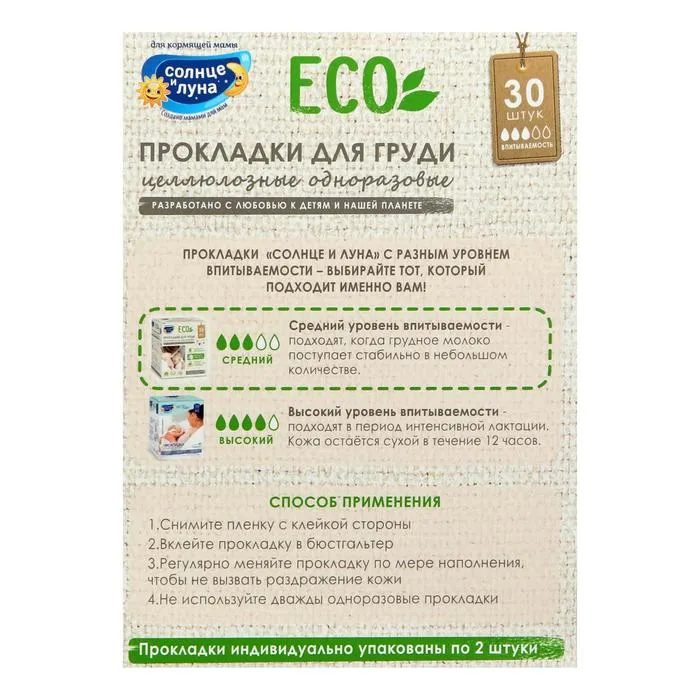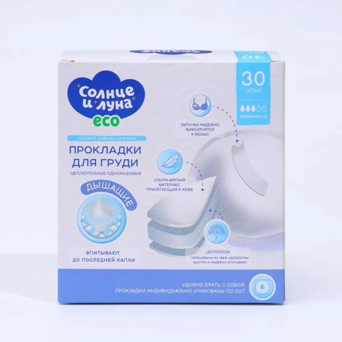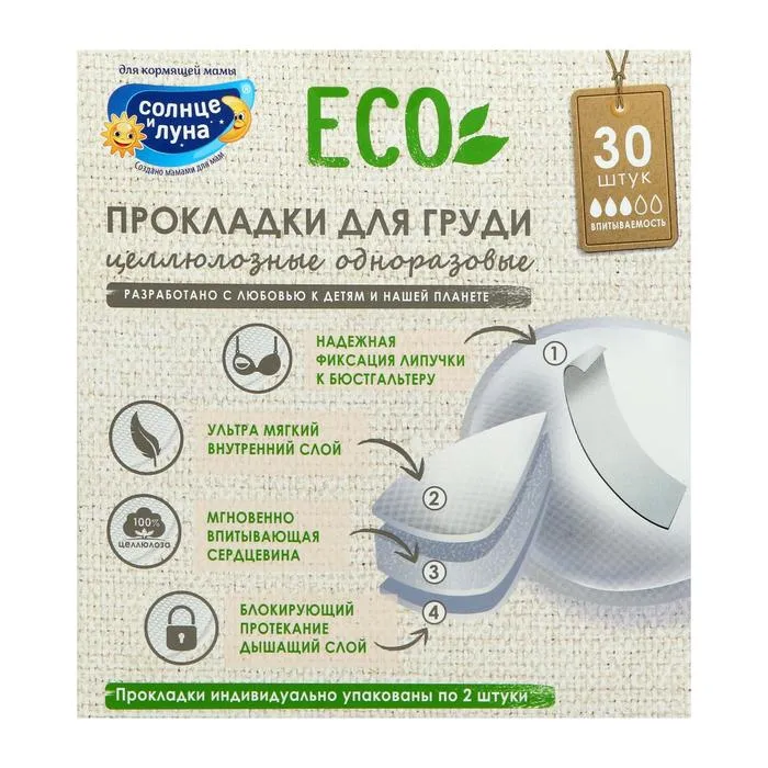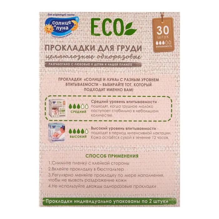 Описание: одноразовые прокладки на грудь для кормящих мам "Солнце и Луна" позволяют облегчить уход за грудью во время лактации. Ультратонкие прокладки "Солнце и луна" отлично впитывают и обеспечивают надежную защиту благодаря специально разработанной многослойной структуре: Супердышаший мягкий нетканый материал всегда остается сухим, предотвращая раздражение и обеспечивая доступ кислорода к коже. Воздухопроницаемый материал поглощает влагу и не дает жидкости выйти наружу.