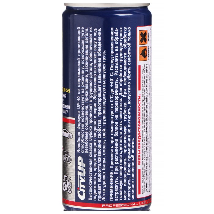 UP-40 - Многофункциональная проникающая смазка.Новейшая формула смазки со сверхвысокой проникающей способностью. Быстро воздействует на ржавчину, освобождая тугие резьбовые соединения, прикипевшие, заклинившие детали.Состав глубоко проникает в микроскопические зазоры сочленений трущихся деталей и резьбы, оседает на их поверхности, обеспечивая подвижность. Предотвращает заедание и скрип. Эффективно вытесняет воду и лед, препятствует дальнейшему обледенению. Легко удаляет битум, смолы, клей, трудновыводимую въевшуюся грязь. Защищает от коррозии и окисления.