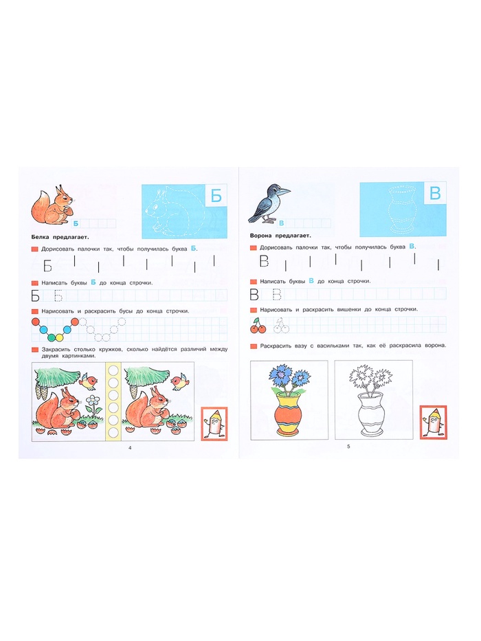 - Вместе со сказочными героями малыш будет обводить по пунктирным линиям предметы, писать печатные буквы, дорисовывать недостающие элементы печатных букв, рисовать символические изображения предметов в клетках.
