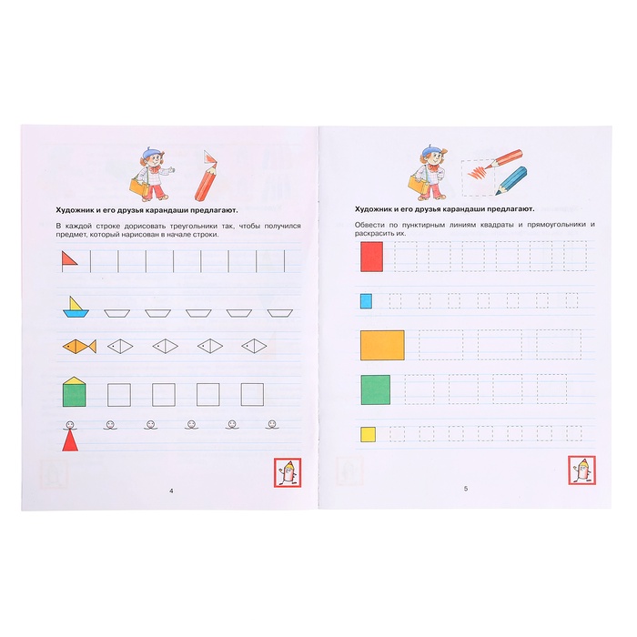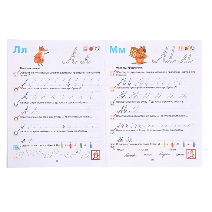 - Вместе со сказочными героями ребёнок научится обводить предметы по пунктирным линиям, писать буквы русского алфавита в клеточке, рисовать предметы в тетради в клеточку, линейку, познакомится с понятиями широкая строка и узкая строка и т. д.