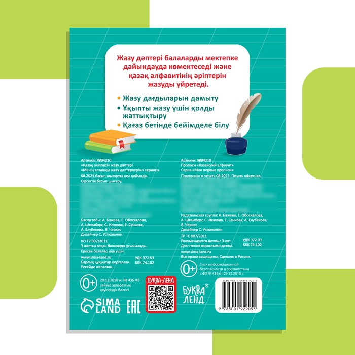 Прописи «Казахский алфавит» предназначены для малыша дошкольного возраста. Они помогают развивать мелкую моторику и мышление, учат запоминать и писать буквы. Такие навыки подготовят руку ребёнка к письму и к школе!