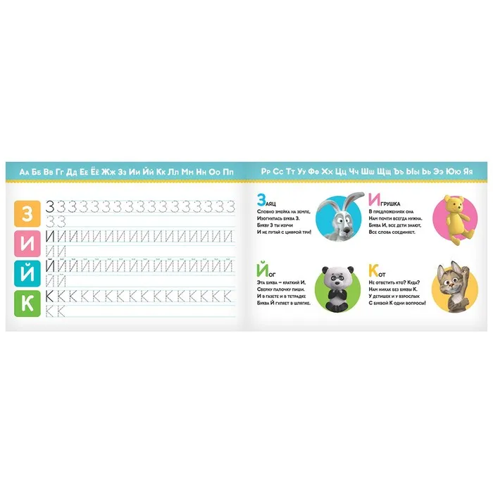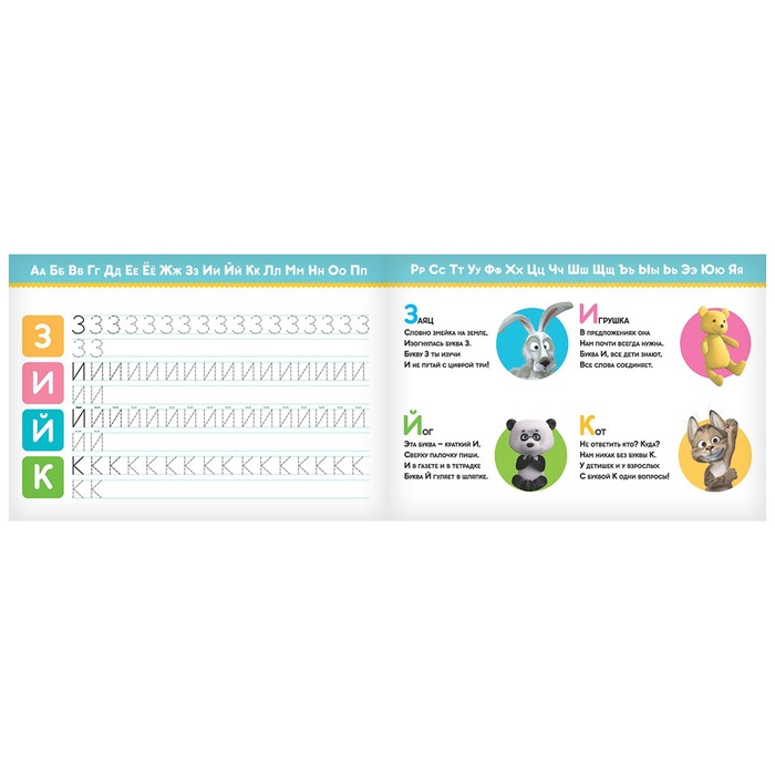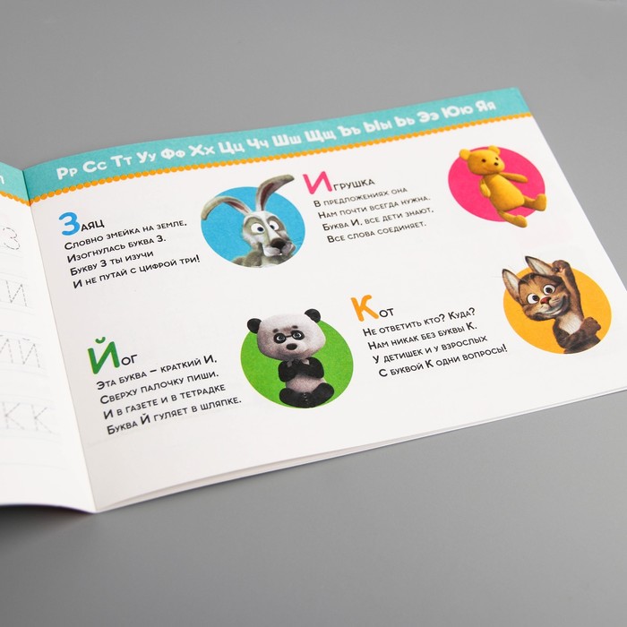 Внутри вы найдёте интересные задания. Выполняя их, малыш выучит буквы и подготовит руку к письму. Также в книге есть забавные иллюстрации с любимыми героями мультфильма «Маша и Медведь».