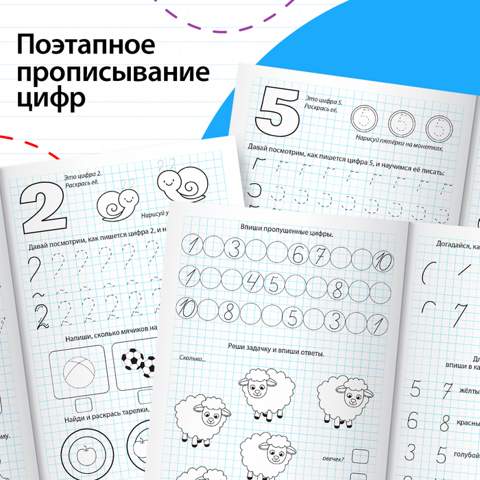 Прописи помогают ребёнку освоить правильное написание цифр и развить мелкую моторику. Каждая страница предлагает задания, которые пробуждают интерес к обучению: от простого обведения линий до самостоятельного написания чисел. Такие упражнения не только готовят руку к письму, но и учат быть внимательным, терпеливым и аккуратным. Благодаря крупному формату и удобной разлиновке, процесс обучения становится доступным и эффективным.