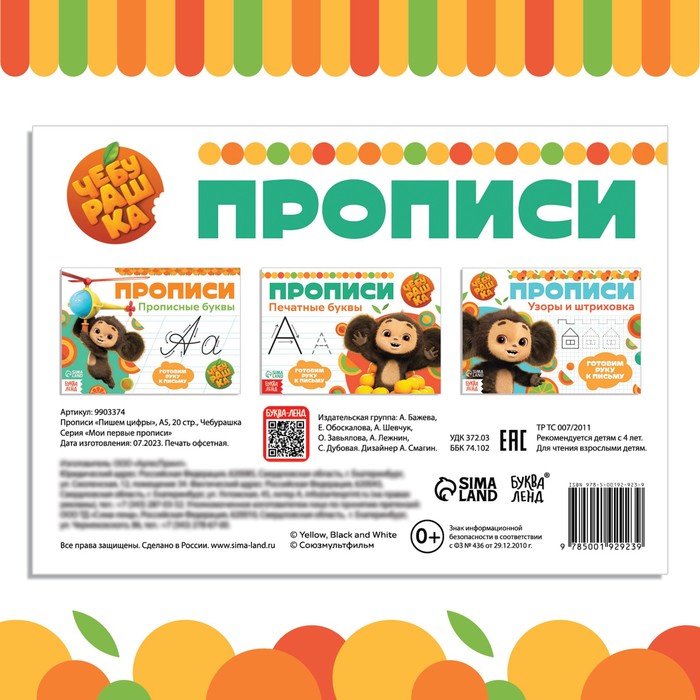 Внутри вы найдёте интересные задания, направленные на изучение счёта. Выполняя их, малыш выучит цифры и подготовит руку к письму, а также научится считать до 9. Также в книге есть забавные иллюстрации с любимыми героями фильма «Чебурашка».