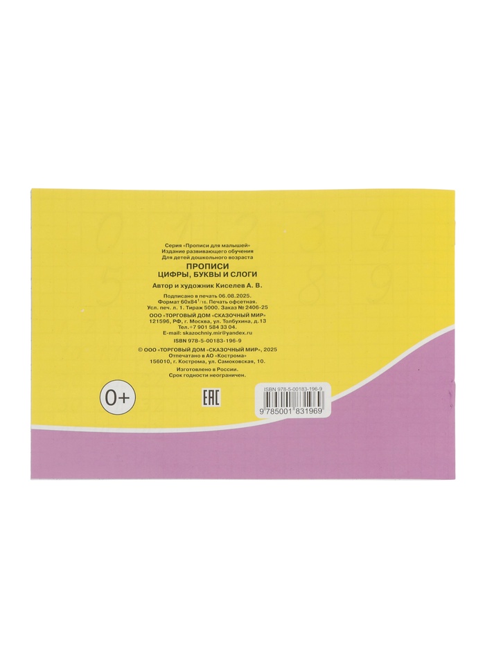Прописи «Цифры, буквы и слоги» — это увлекательное пособие для детей от 3 лет, которое помогает освоить базовые навыки письма и счёта. Мягкий переплёт и удобный формат делают их практичными для занятий дома или в детском саду.