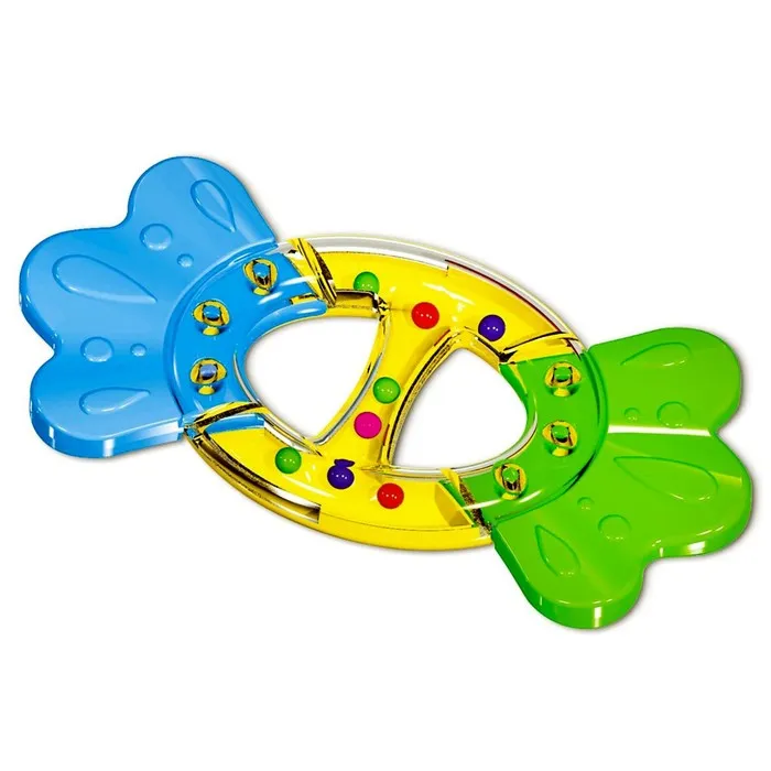 Прорезыватель-погремушка стимулирует развитие зрительно-слуховой чувствительности и помогает наблюдать за движением и слухом.