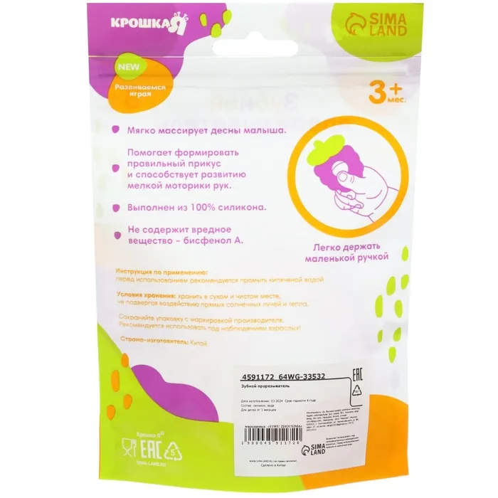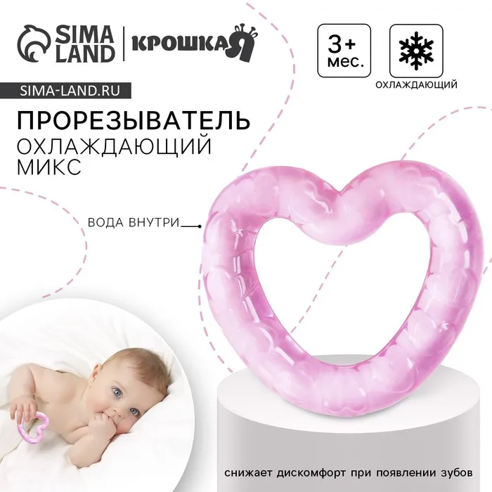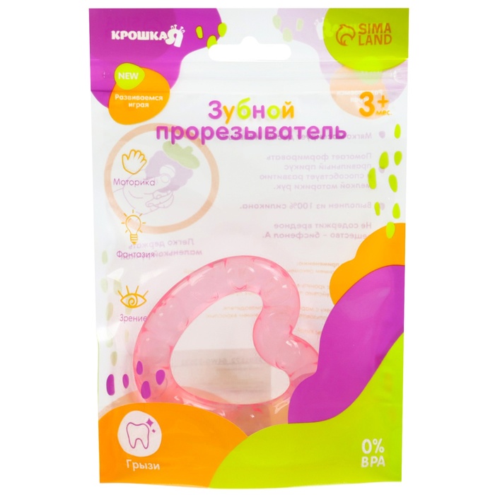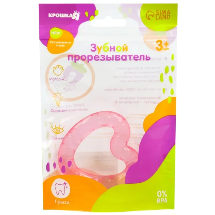 Специальная жидкость внутри поможет снизить воспаление в ротовой полости и снять болевые ощущения. Для охлаждения прорезывателя поместите его в холодильник на 10‒15 минут. Форма ручки и размеры разработаны специально для детской ладони, поэтому малышу будет удобно её держать. Рельефная структура на поверхности изделия и его дополнительных элементов будет способствовать развитию мелкой моторики, а яркие цвета — формированию визуального восприятия мира.
