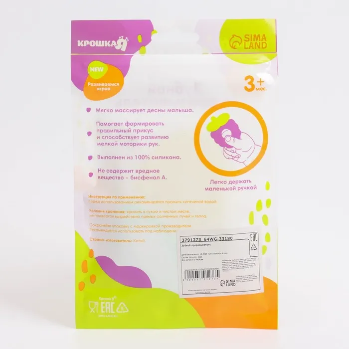 Прорезыватель снимает неприятные ощущения в период появления первых зубов. Также изделие подготовит ребёнка к процессу жевания, поспособствует формированию правильного прикуса и развитию мелкой моторики рук.Перед использованием предмет рекомендуется охладить (в воде или холодильнике). Внутри грызунка находится дистиллированная жидкость, которая сохраняет низкую температуру. Покусывая такой прорезыватель, кроха быстрее почувствует облегчение. Приспособление смягчит боль, уменьшит отёк и зуд в ротовой полости.Особенности:рельефные элементы для массажа дёсен;мягкий и эластичный материал;оптимальные форма и размер для детской ладони;охлаждающий эффект.Внимание! Не помещайте прорезыватель в морозильную камеру.Товар изготовлен из прочного и безопасного силикона, не содержащего бисфенола А. Подходит для детей от 3 месяцев.