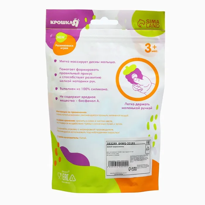 Форма и размеры изделия разработаны специально для детской ладони. Его рельефная текстура будет способствовать развитию мелкой моторики, а яркие цвета — формированию визуального восприятия у ребёнка.
