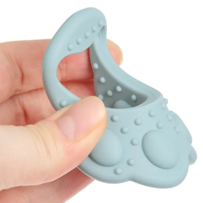 Прорезыватель снимает неприятные ощущения у малыша в период появления первых зубов. Также изделие подготовит ребёнка к процессу жевания, поспособствует формированию правильного прикуса и развитию мелкой моторики рук.