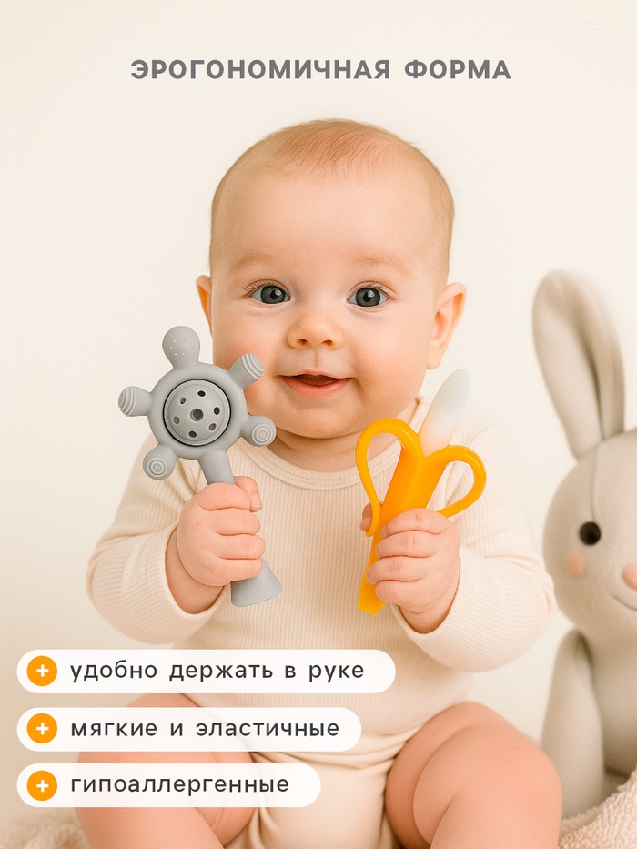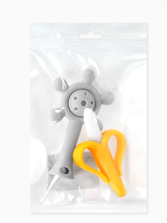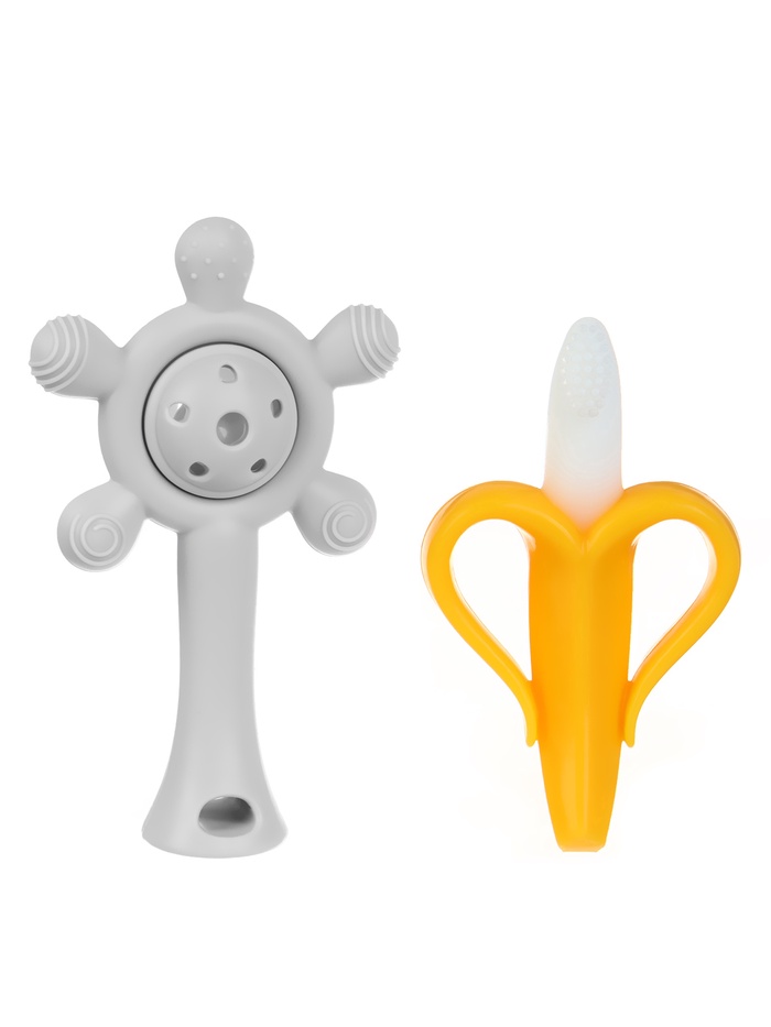 - Набор включает два прорезывателя: классический в форме банана и модель с погремушкой для сенсорного развития.