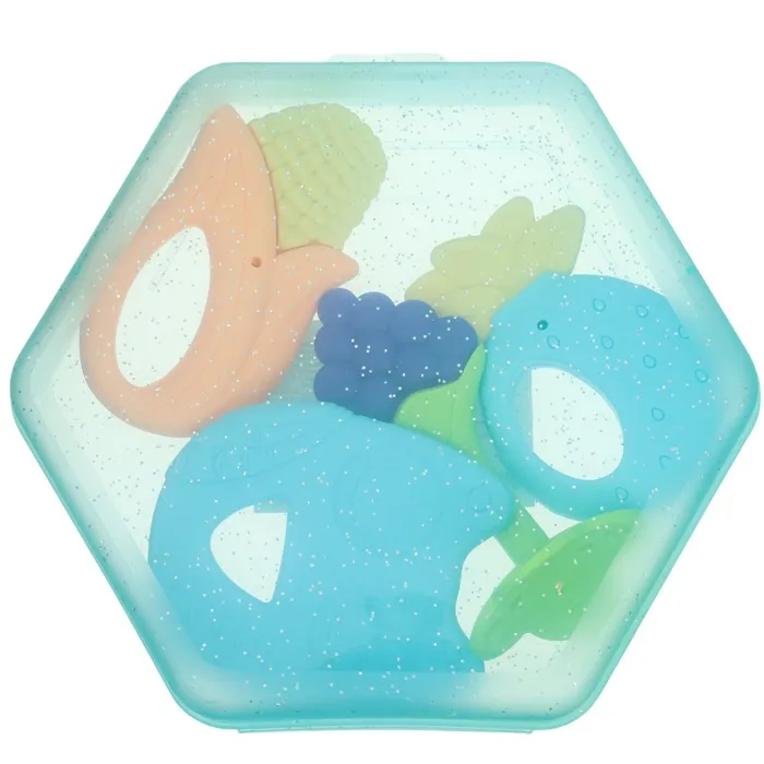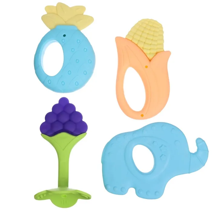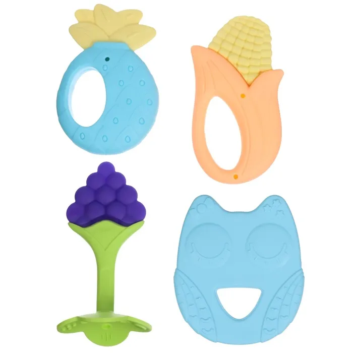 Прорезыватель снимает неприятные ощущения у малыша в период появления первых зубов. Также изделие подготовит ребёнка к процессу жевания, поспособствует формированию правильного прикуса и развитию мелкой моторики рук. Погремушка в наборе способствует развитию воображения, познанию мира звуков, цветов и визуальному восприятию.