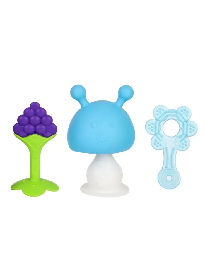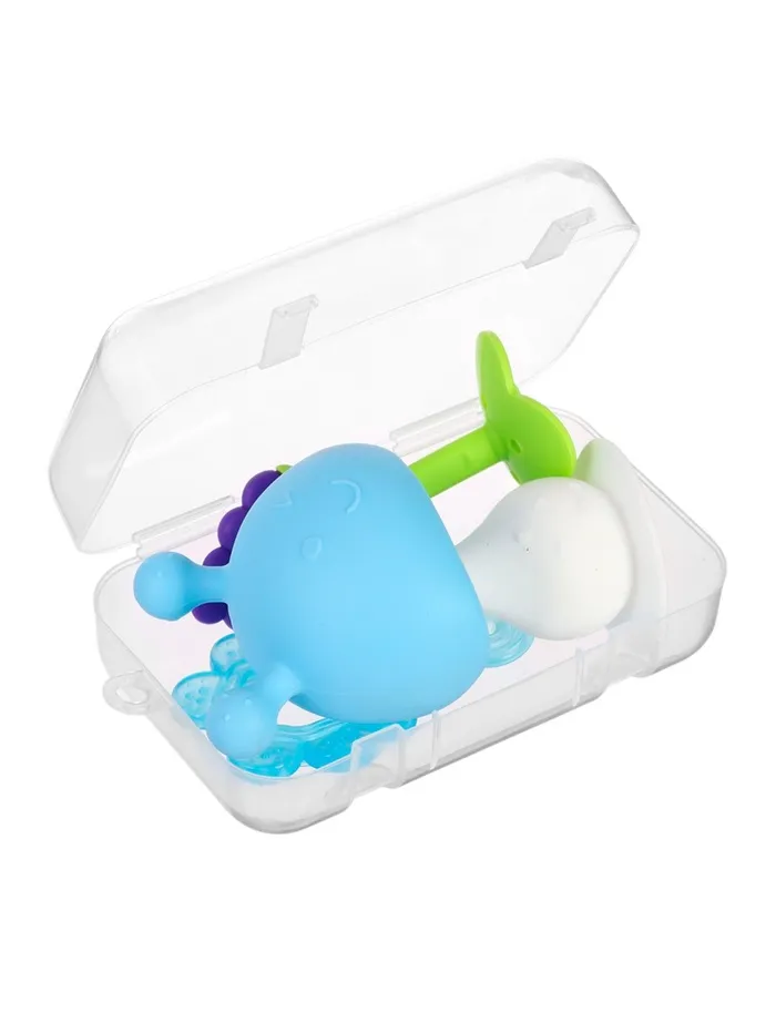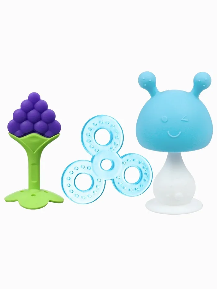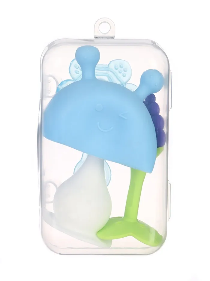 Прорезыватель снимает неприятные ощущения у малыша в период появления первых зубов. Также изделие подготовит ребёнка к процессу жевания, поспособствует формированию правильного прикуса и развитию мелкой моторики рук. Погремушка в наборе способствует развитию воображения, познанию мира звуков, цветов и визуальному восприятию.